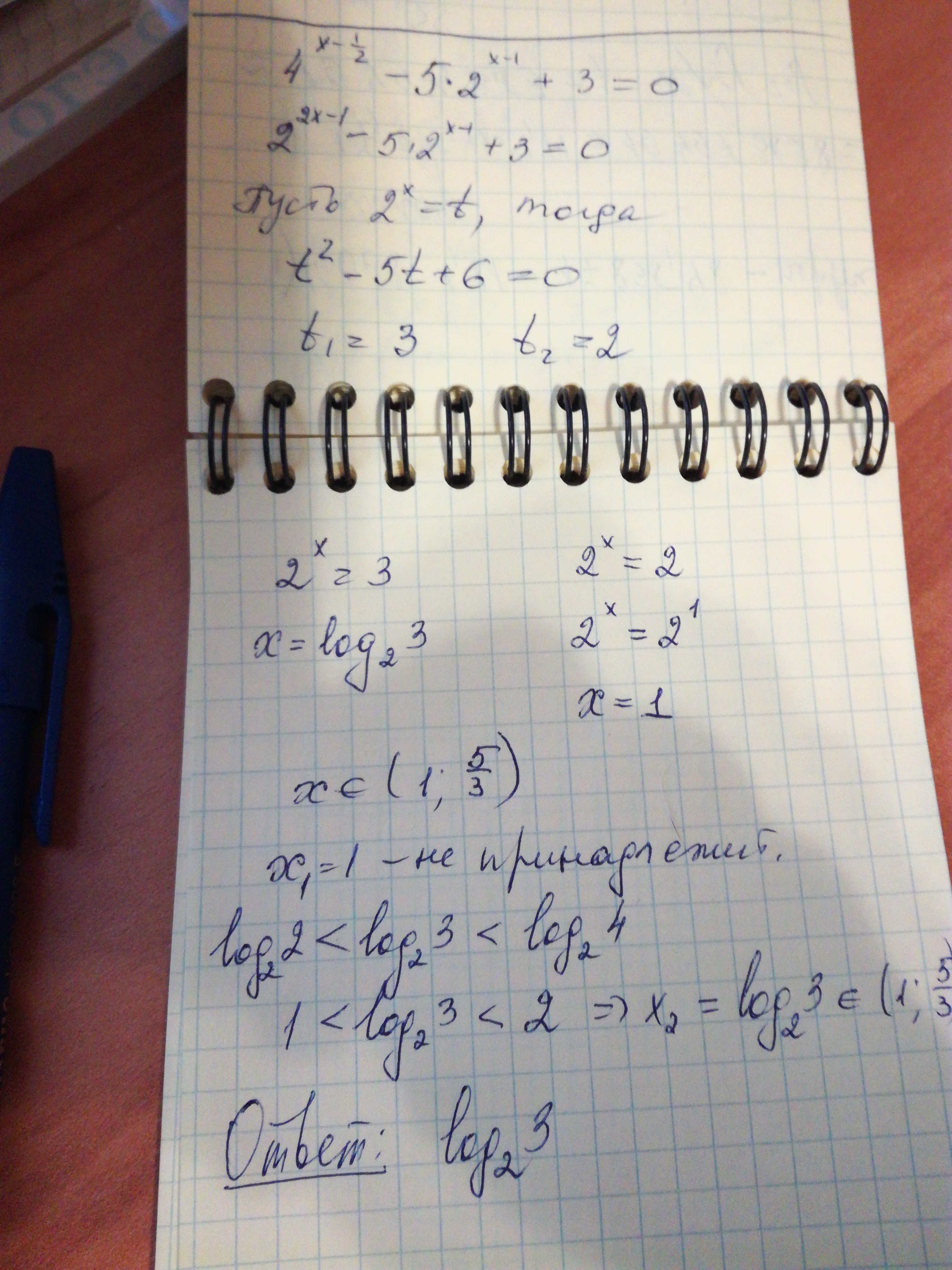Решите уравнение: 4^(x-1/2)-5*2^(x-1)+3=0 Найдите все корни этого уравнения,принадлежащие промежутку (1;5/3)