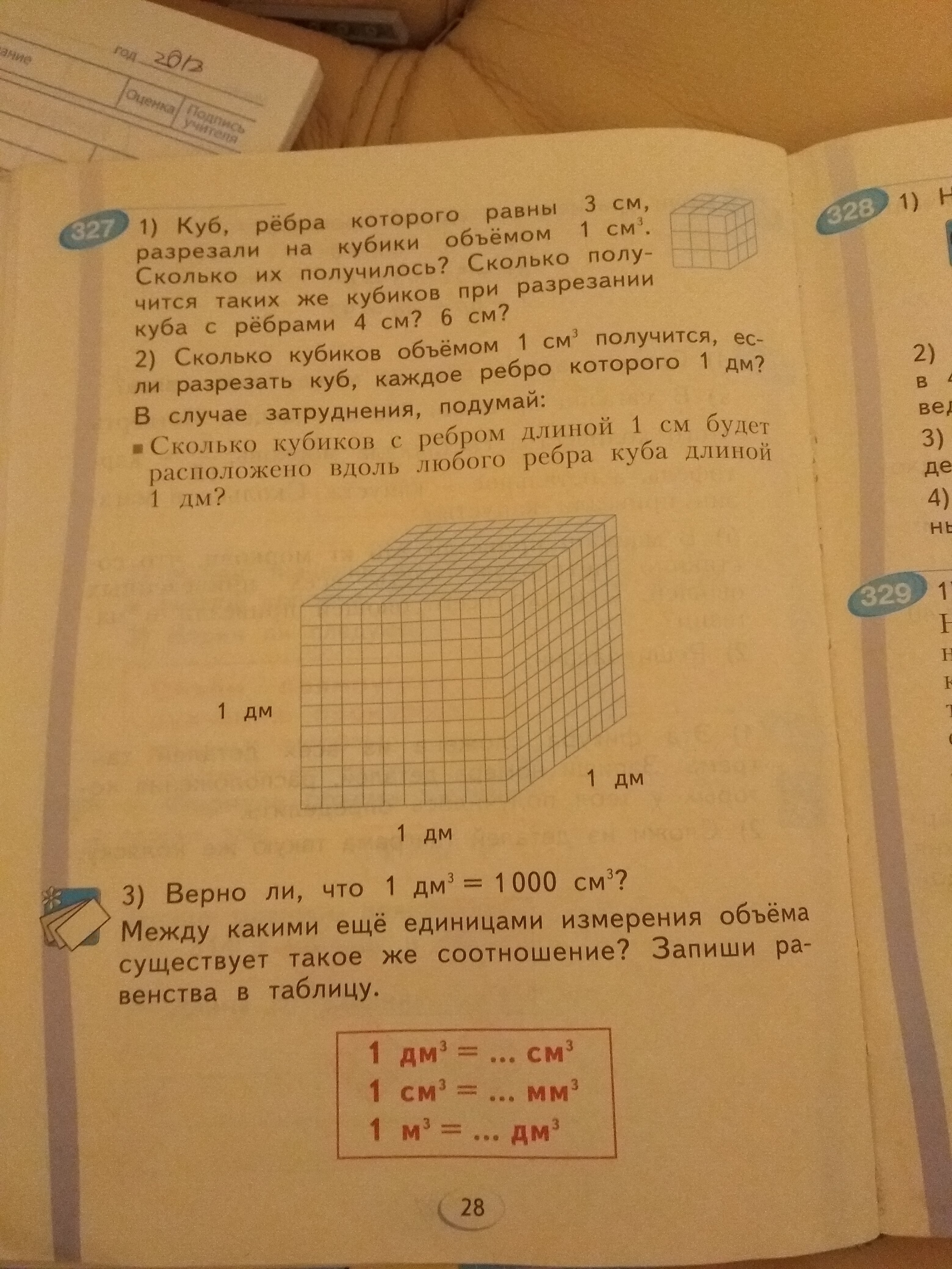 Найдем обьем кубика - 3×3×3=27см3; 27см3 ÷ 1см3 = 27 кубиков; При ребре 4 см обьем будет 64см3, тогда кубиков будет 64; При ребре 6 см обьем будет 216 см3, тогда и кубиков будет 216; 2) 1дм равно 10см, тогда обьем равен 10×10×10=1000, и кубиков будет тоже 1000
