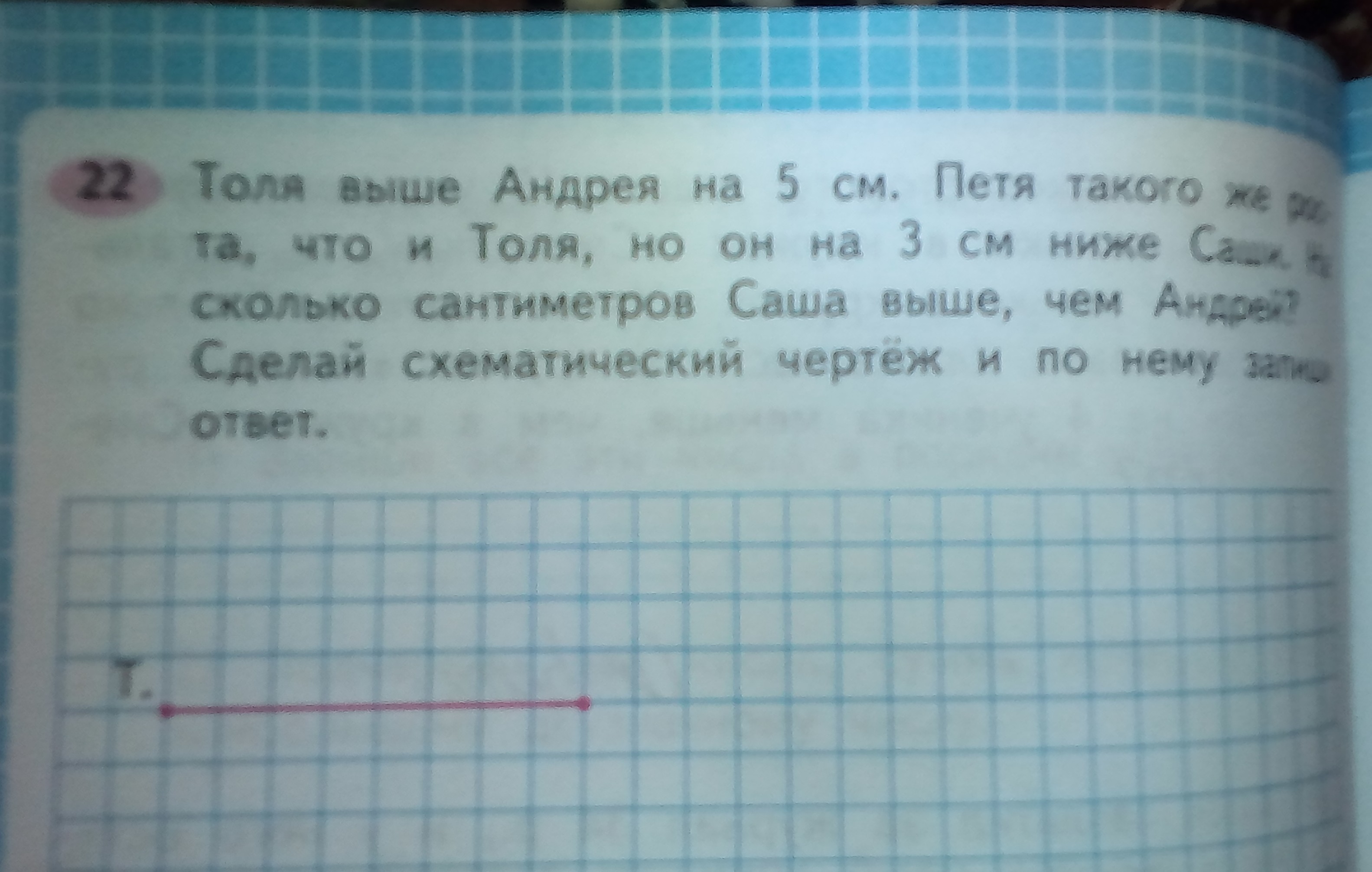 Толя выше Андрея на 5см. Петя такого же роста,что и Толя,но он на 3см ниже Саши. на сколько сантиметров Саша выше,чем Андрей? сделай схематический чертеж и по нему запиши ответ.