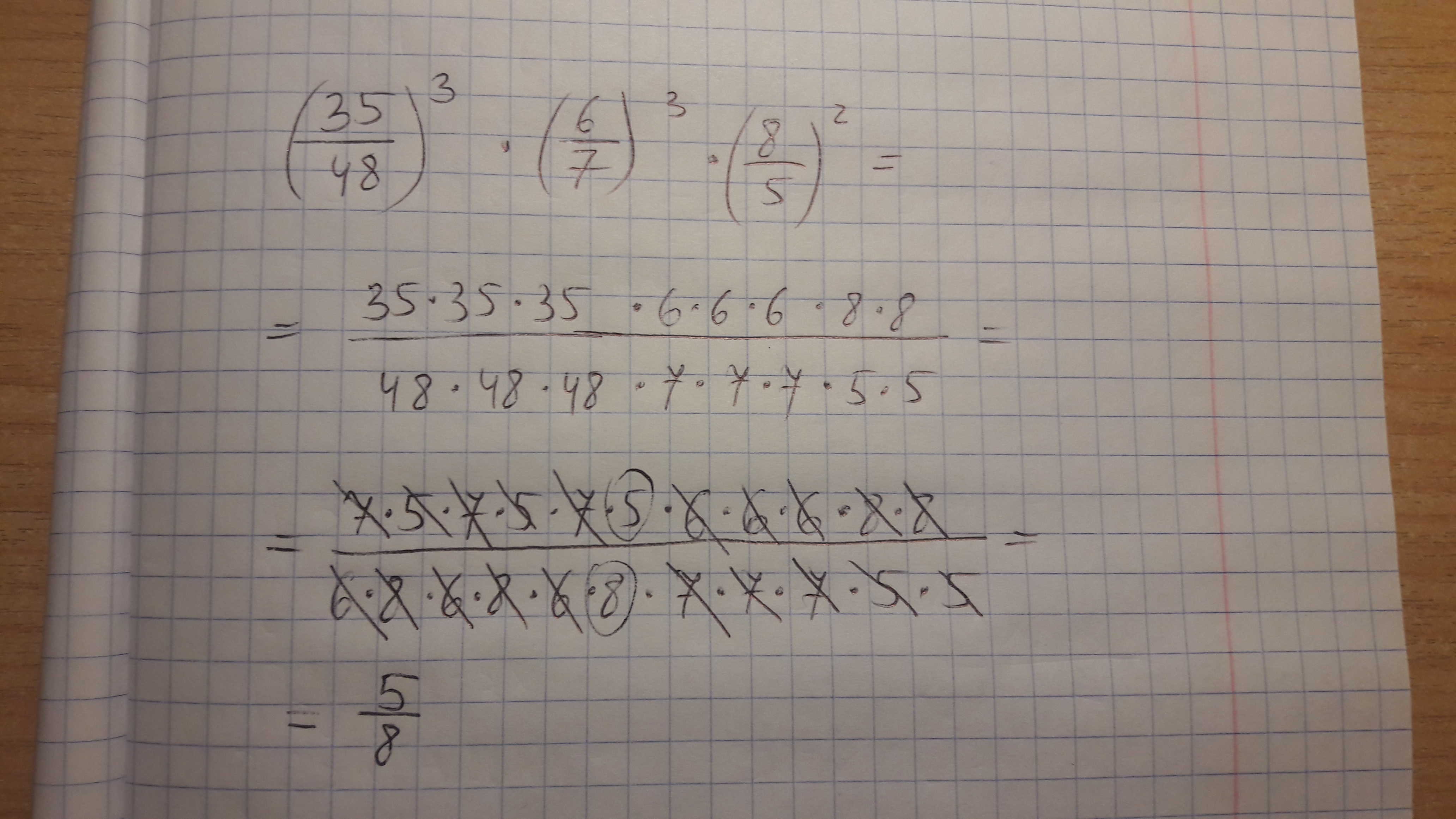 (35/48) в 3 степени умножить на (6/7) в 3 степени умножить на (8/5) во 2 степени. Помогите решить, желательно подробно.