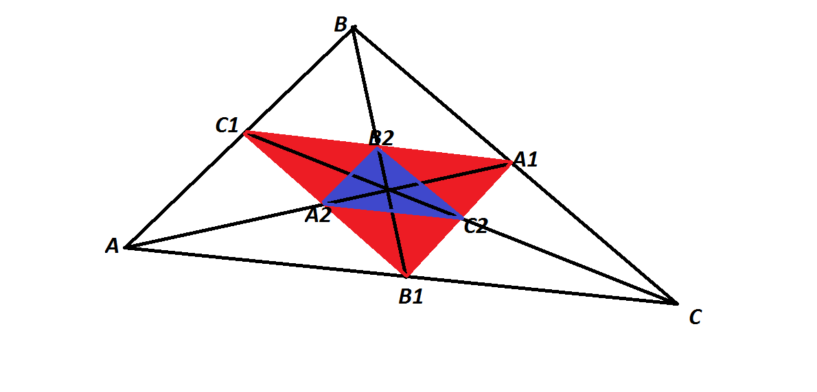 Дан треугольник ABC, проведены медианы, точки пересечения медиан со сторонами образуют треугольник A1B1C1, проведены новые медианы треугольника A1B1C1, точки пересечения медиан со сторонами образуют треугольник A2B2C2.