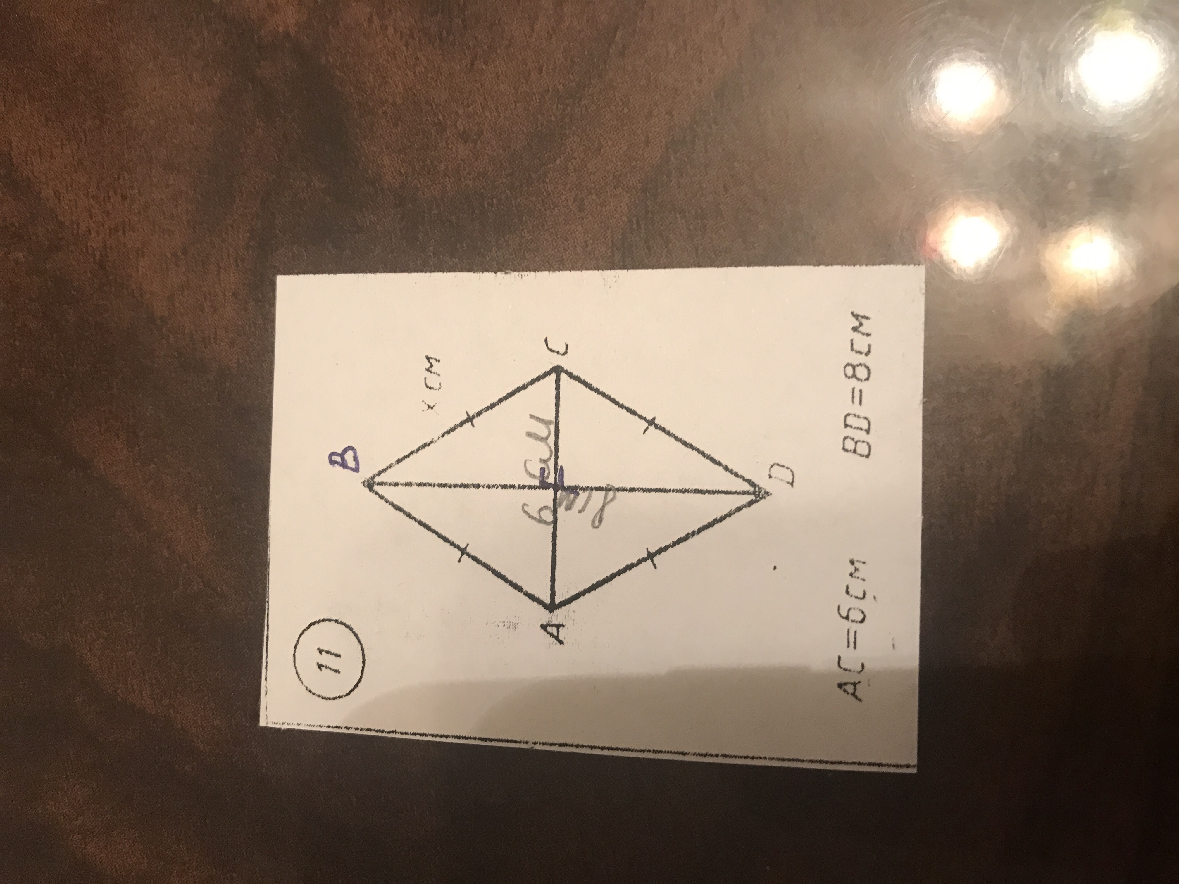 В ромбе диагонали пересекаются точкой пересечения пополам, а помимо того образуется угол в 90 градусов, отсюда: