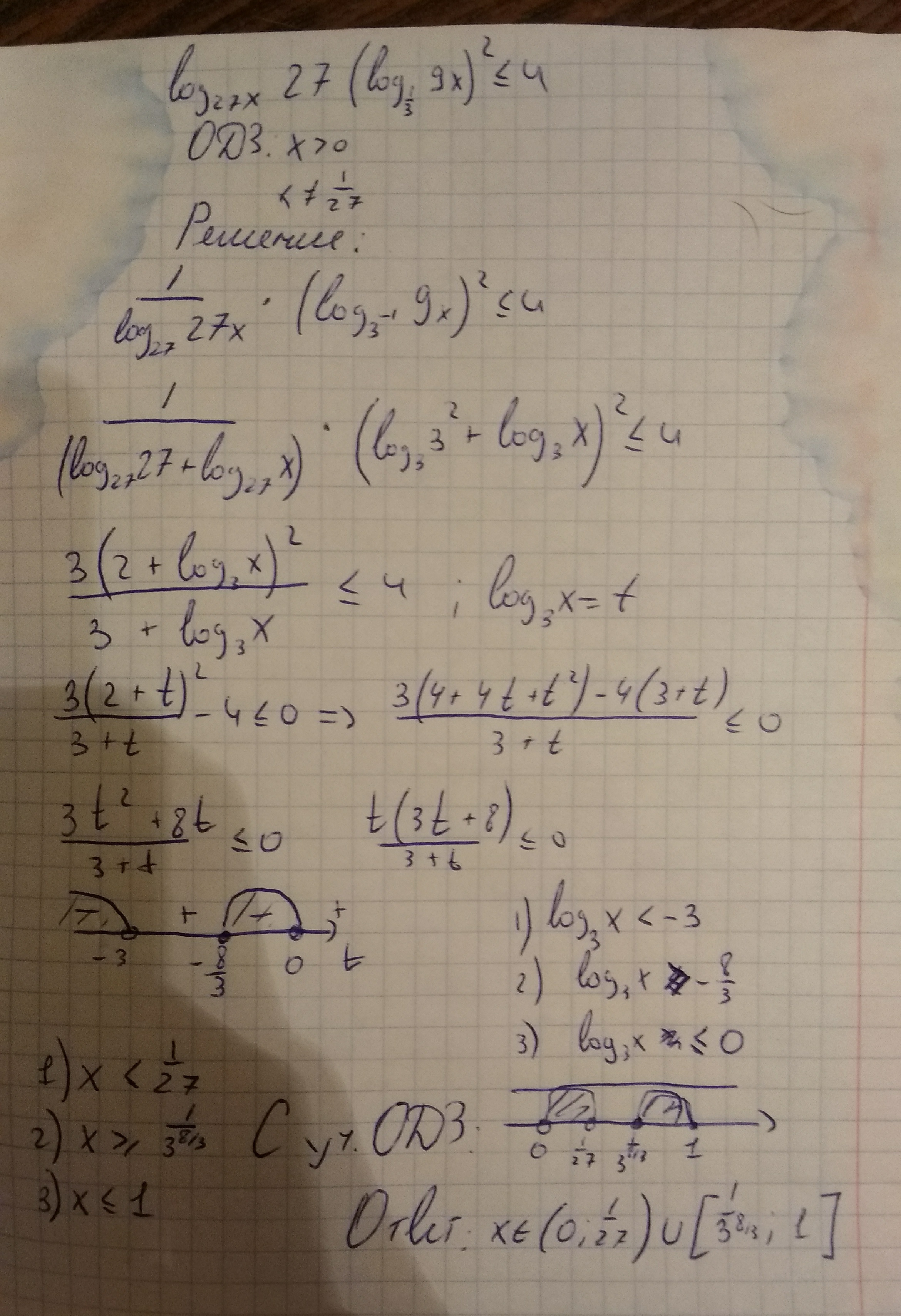 log 27x 27 * log^2 1/3 (9x) меньше или равно 4