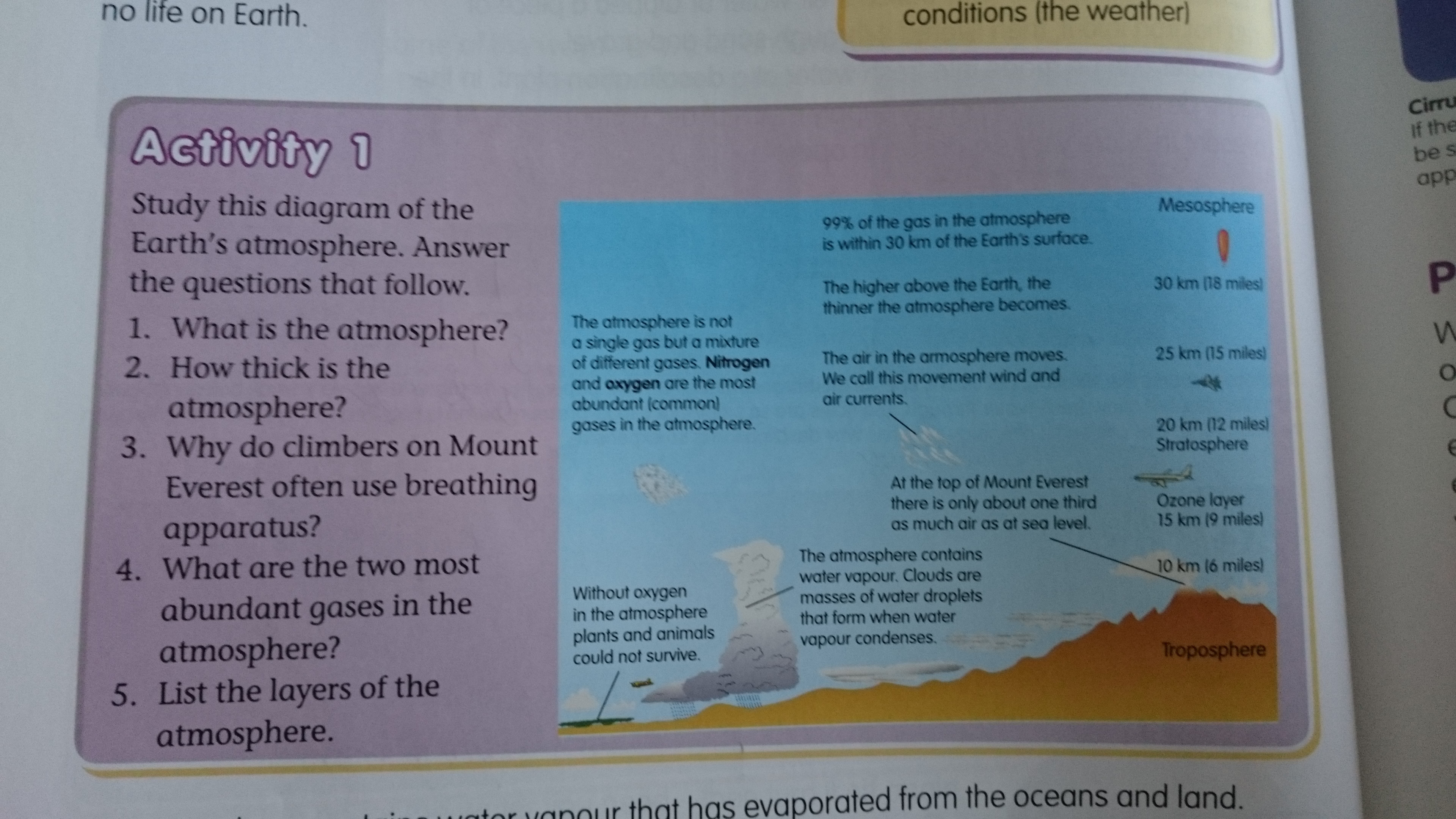 5) Troposphere, Ozone layer, Stratosphere, Mesosphere.