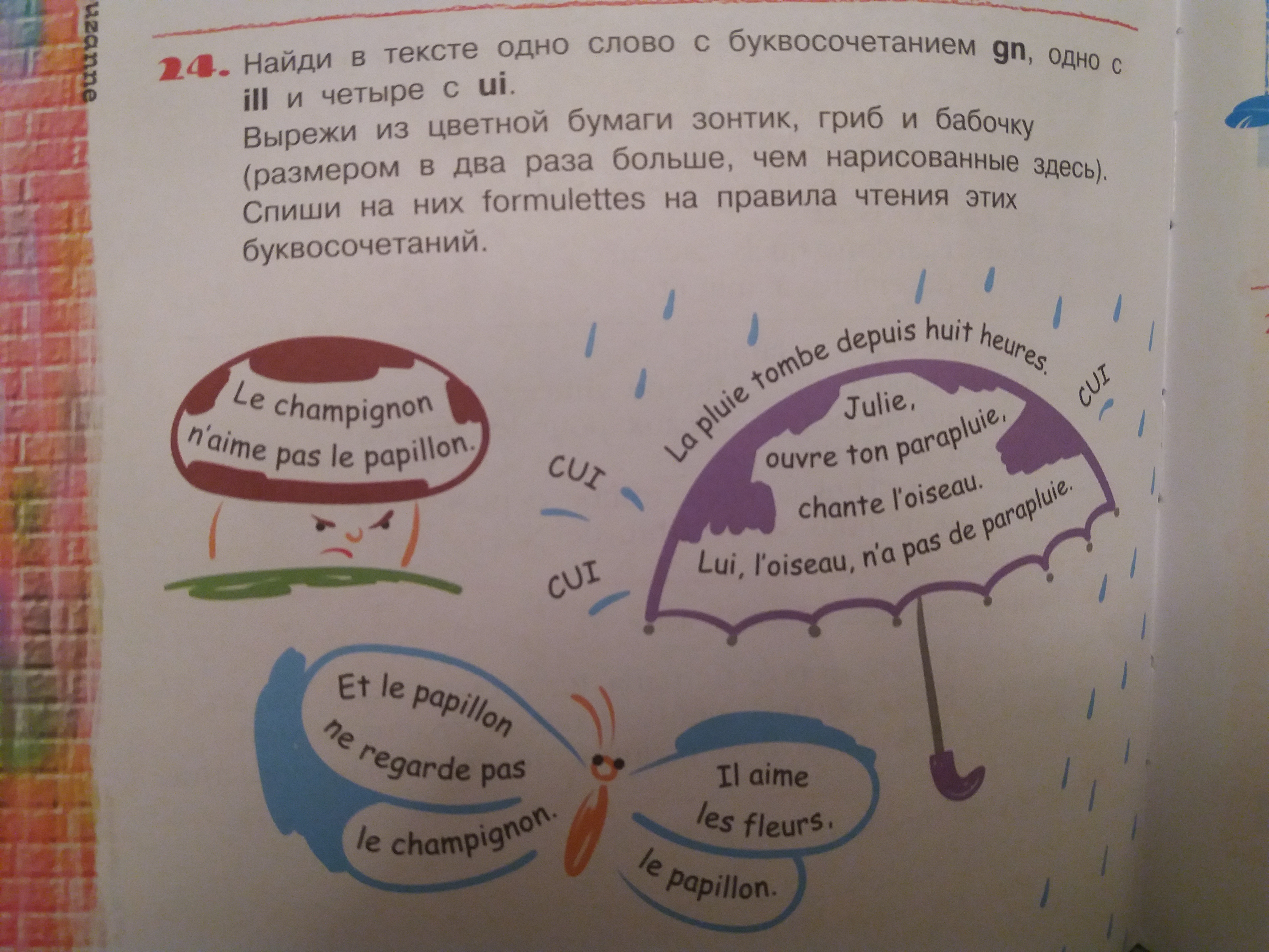 на грибе - гриб не любит бабочку. сверху зонта - дождь идет в течение 8 часов. на зонте - Жюли, открой свой зонт, - поет птица. на бабочке - бабочка не смотрит на гриб. Бабочка, она любит цветы.