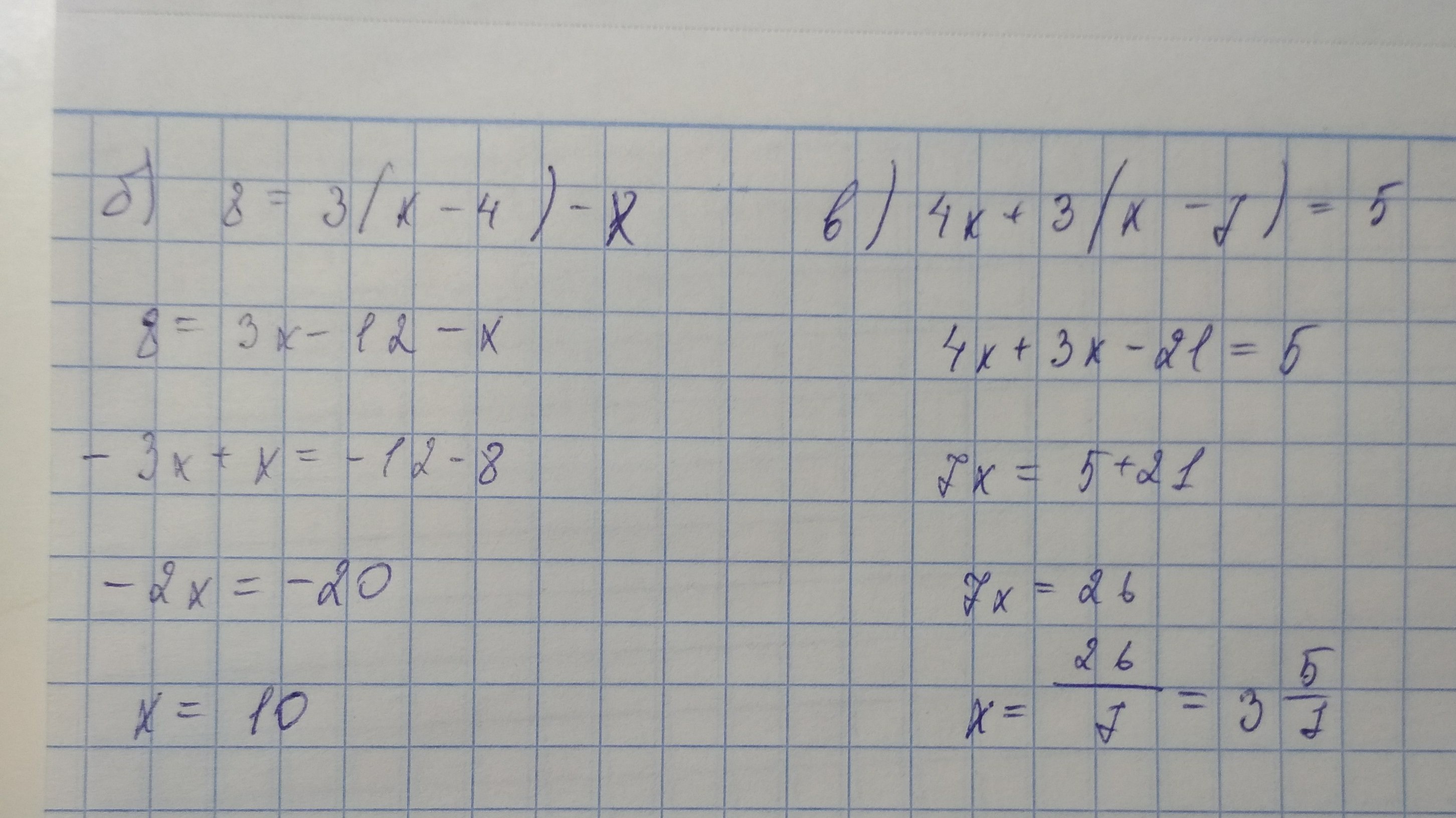 решите уравнение б) 8=3(х-4)-х в) 4х + 3(х-7)=5 Мне нужен не только ответ, но и ход решений. Спасибо.