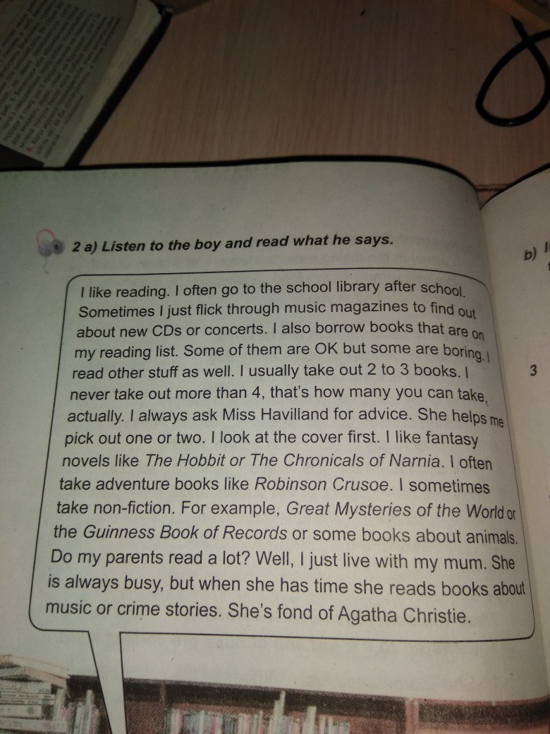 Я люблю читать книги Я часто после школы хожу в школьную библиотеку. Я просто пролистываю музыкальные журныалы, что бы узнать о новых CD- дисках или концертах. Я также беру на время книги на читательниц лист! Некоторые из них хороши, некоторые скучные. Я читаю другой материал также хорошо. Я обычно беру 2-3 книги. Я никогда не буду больше, чем 4, это сколько я на самом деле могу взять. Я всегда спрашиваю Мисс Хэливанд! Я люблю фантастические новеллы, такие как Хоббит или хроники Нарнии. Я часто беру документальную литературу! Например, великие таинства мира или книга рекордов Гиннеса или какие-либо книги про животных. Мои родители много читают? Да Я живу с мамой. Она всегда занята, но когда у неё есть время, она читает книги о музыке или криминальных историях. Она любит Агаду Кристи!