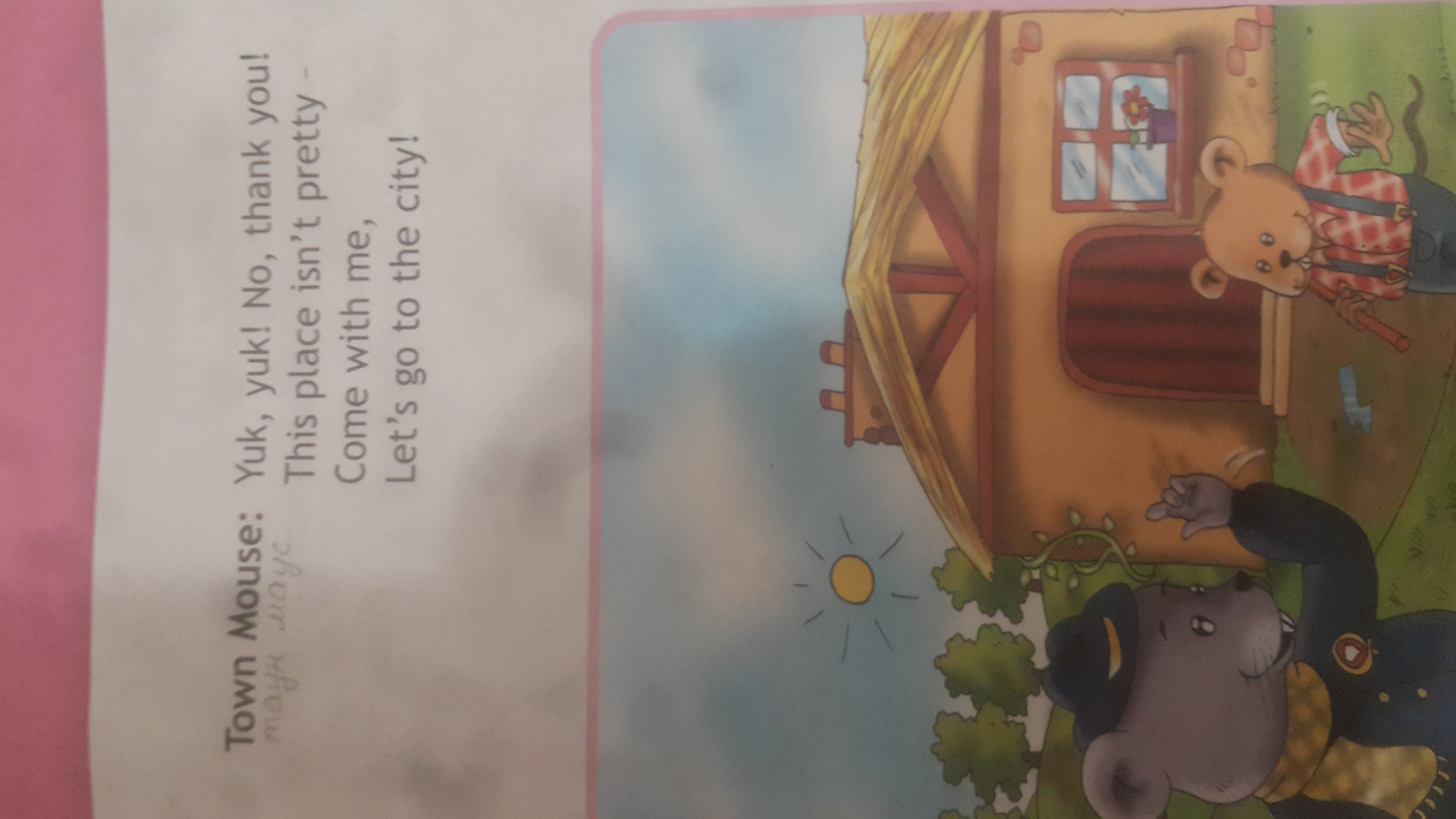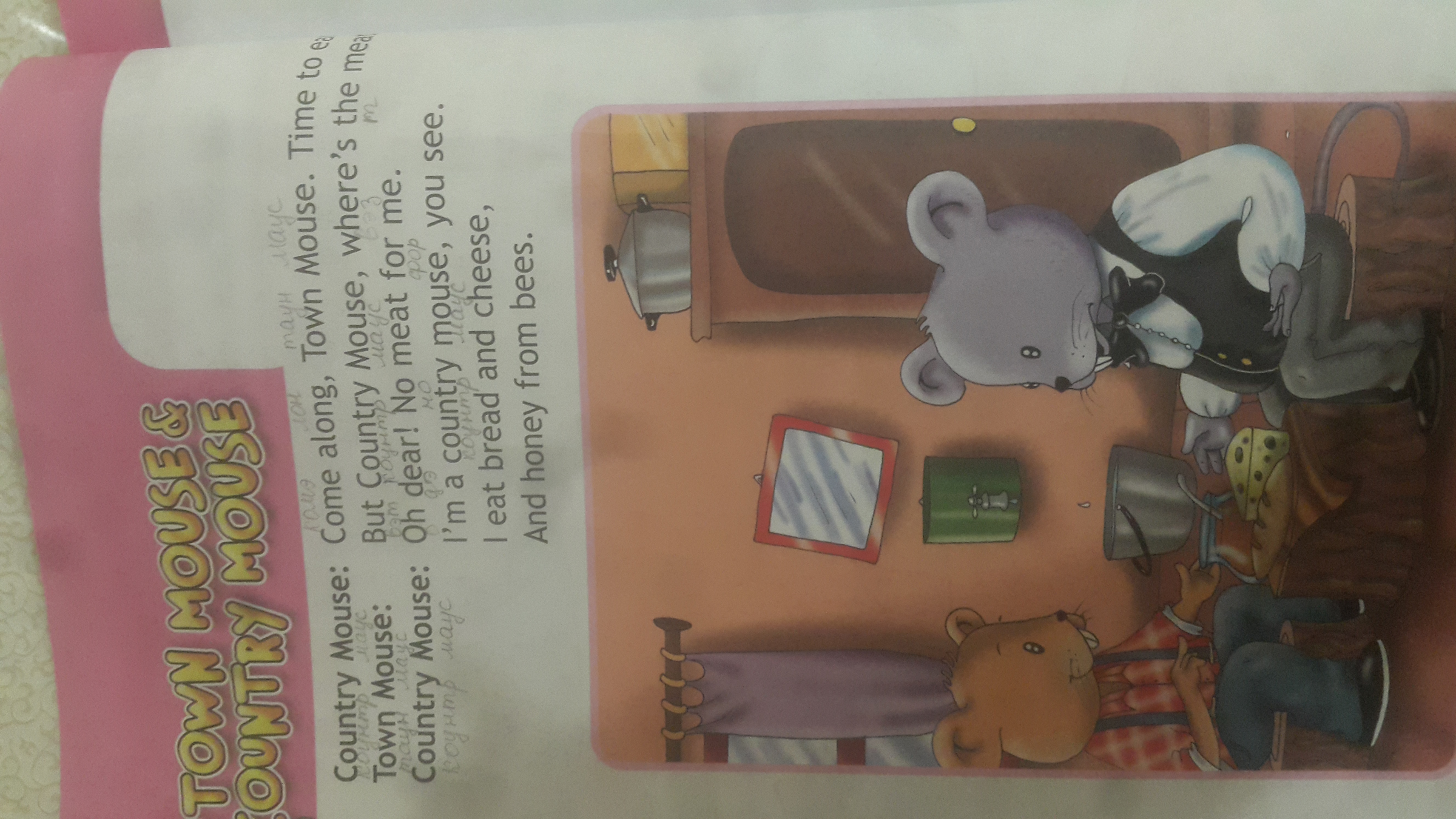 Пойдёмте,Городская мышь. Время есть,но есть Страна мыши, где мясо. Боже мой! Не надо мяса мне,я деревенская мышь, вы видеть,я ем хлеб и сыр и мёд из пчёл.