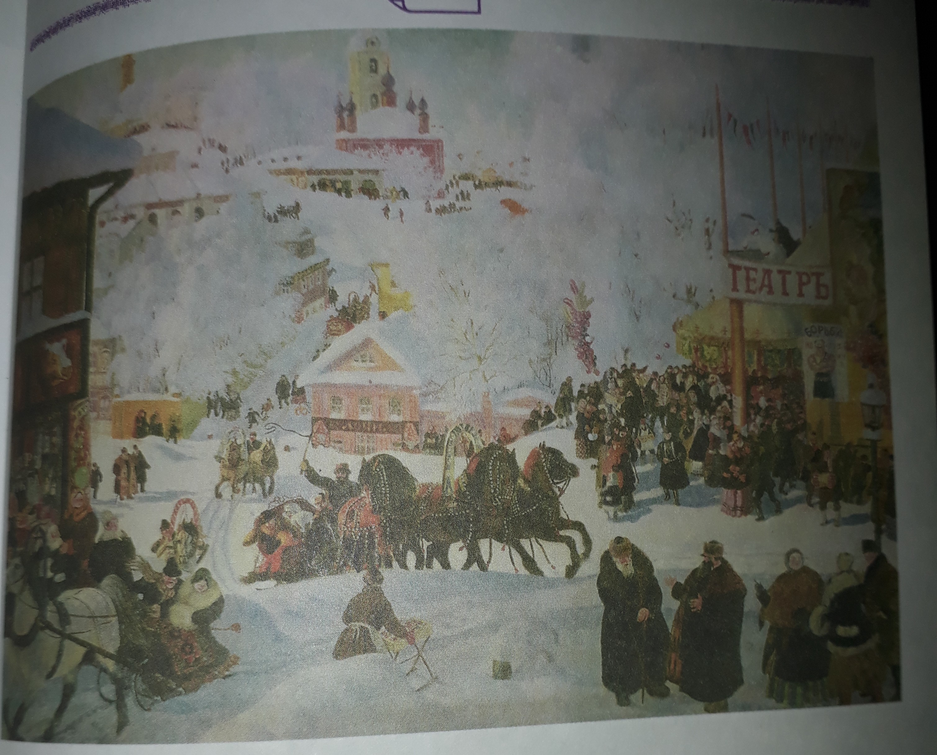 на данной картине мы видим оживленный город . все потому что в город пришел праздник маслиница . взрослые катают детей на санях