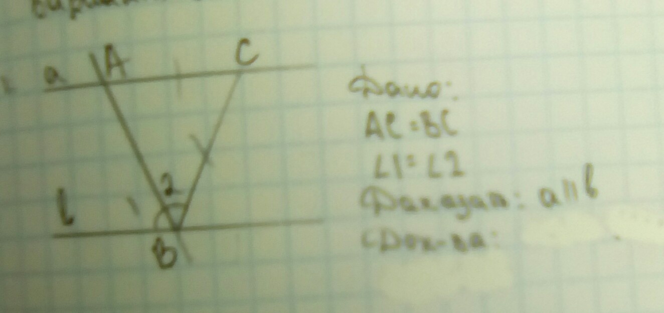 AC=AB , следовательно треуг. ABC равнобедренный с основанием AB, следовательно угол CAB=угол 2, но угол 2 = углу 1, а значит прямые параллельны по накрест лежащим углам.