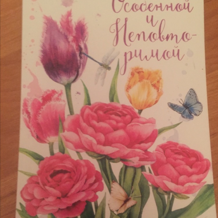 Обьемная открытка с ярко-красочными цветами. Яркие розочки и прекрасные тюльпаны напоминают нам о теплых летних денечках .Судя по тексту предназначена любимой маме,сестре или девушке.Также на открытке можно увидеть летающих бабочек и стрекозу.