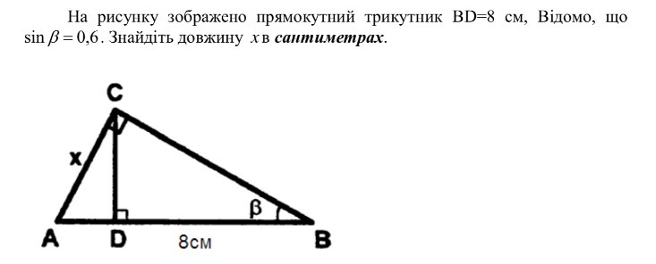 На рисунке изображен прямоугольный треугольник BD = 8 см, sin B = 0,6. Найдите длину х