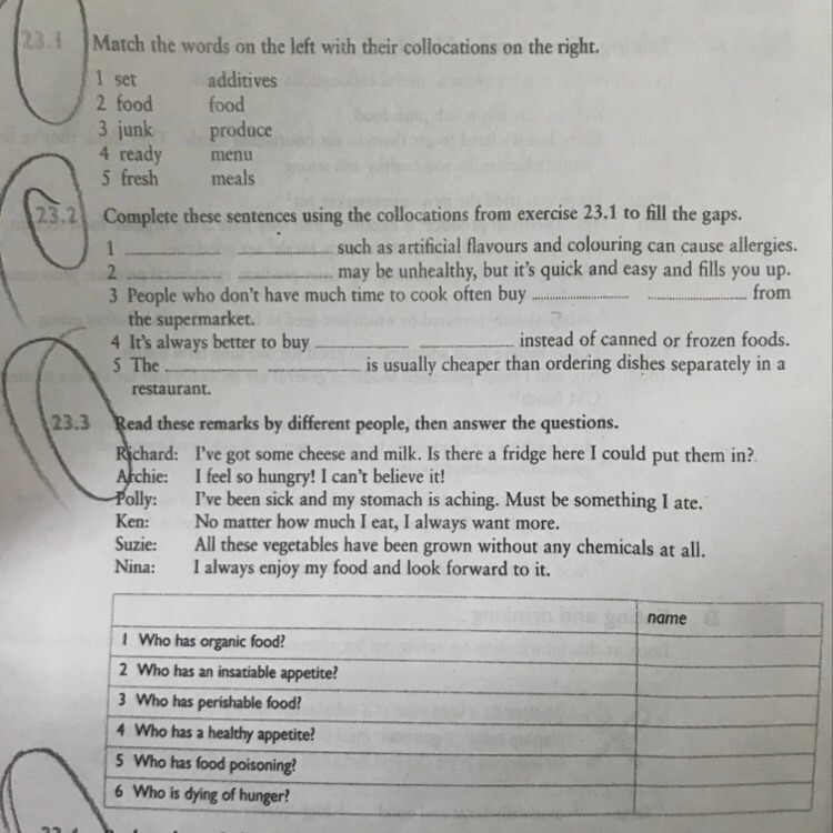 23.1 1- set menu, 2-food additives,3-junk food,4-ready meals,5-fresh produce.