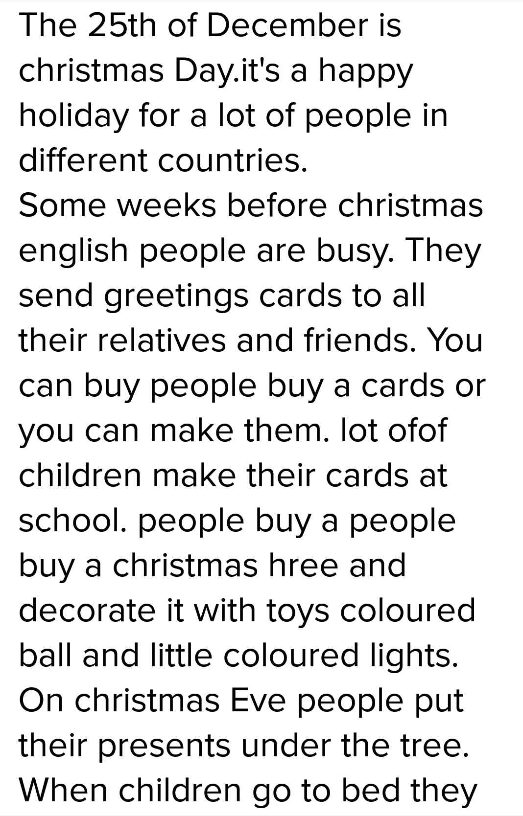 25 декабря Рождество. Это счастливые каникулы для множества людей из разных стран. За несколько недель до Рождества англичане заняты. Они отправляют поздравительные открытки всем родным и друзьям. Вы можете купить людям открытки ли сделать их самим. Много детей делают свои открытки в школе. Люди покупают рождественские ёлки и украшают их игрушками, разноцветными шарами и гирляндами. В канун рождества люди кладут их подарки под ёлку. Когда дети ложатся спать они...