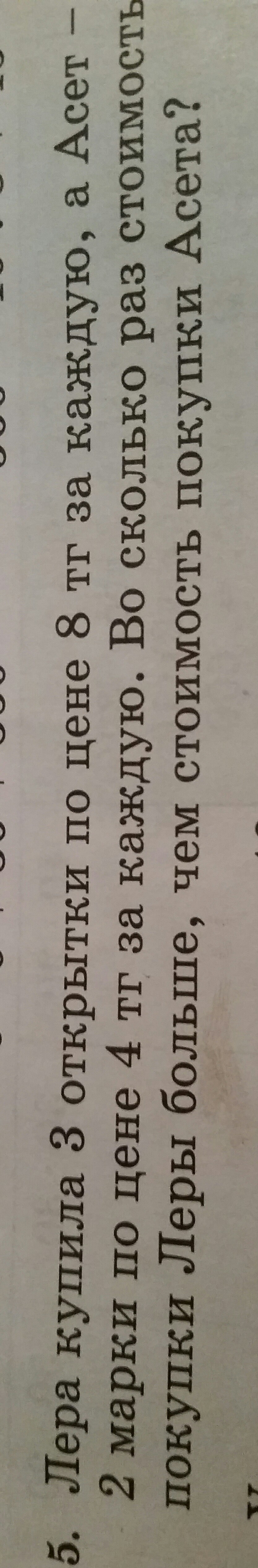 Ответ. в 3 раза стоимость покупки Леры больше, чем стоимость покупки Асета.
