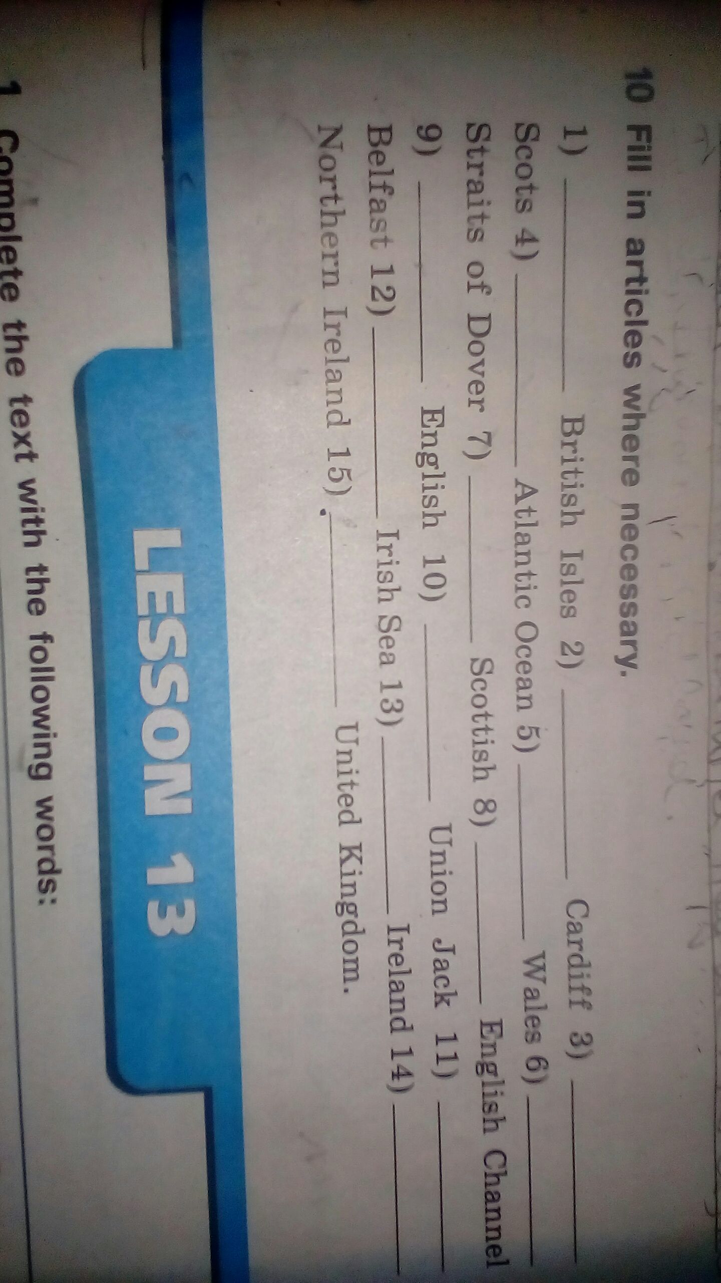 1) The British Isles, 2) Cardiff, 3) The Scots, 4)The Atlantic Ocean, 5) Whales, 6) The Straits of Dover, 7) Scottish, 8) The English Channel, 9) English, 10) The Union Jack, 11)Belfast, 12) The Irish Sea, 13) Ireland, 14) Northern ireland, 15) The United Kingdom