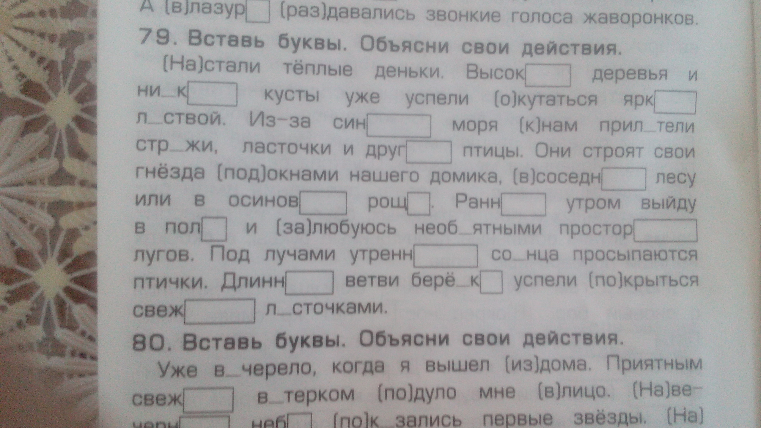 Настали (слитно, так как на -это приставка) Высокие деревья (множ. число) , низкие( проверочное слово - низы) , окутаться ( о -приставка), яркой( окончание -ой, так как листвой - ж.р, творительный падеж) листвой (лист) , синего (м.р. Р.П.), к нам ( предлоги со словами пишутся раздельно) , прилетели (прилет), стражи (а находится под ударением), другие (мн.ч.), под окнами(под -это предлог)