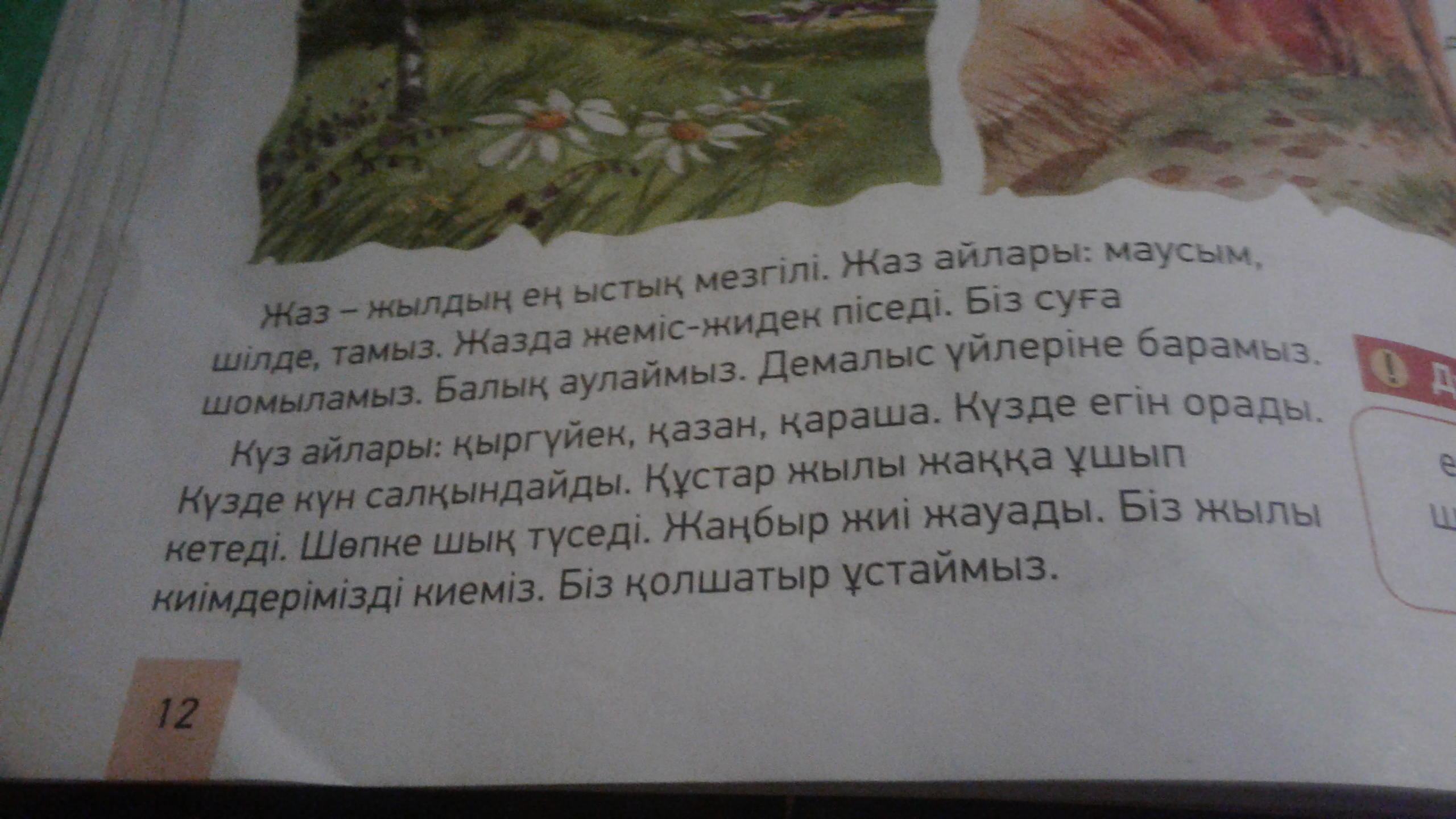 Күз айлары: қыркүйек, қазан, қараша. Күзде егін орады. Күзде егін орады. Күзде күн салқындайды. Құстар жылы жаққа ұшып кетеді. Шөпке шық түседі. Жаңбыр жиі жауады. Біз жылы киімдеріміз киеміз. Біз қолшатыр ұстаймыз.