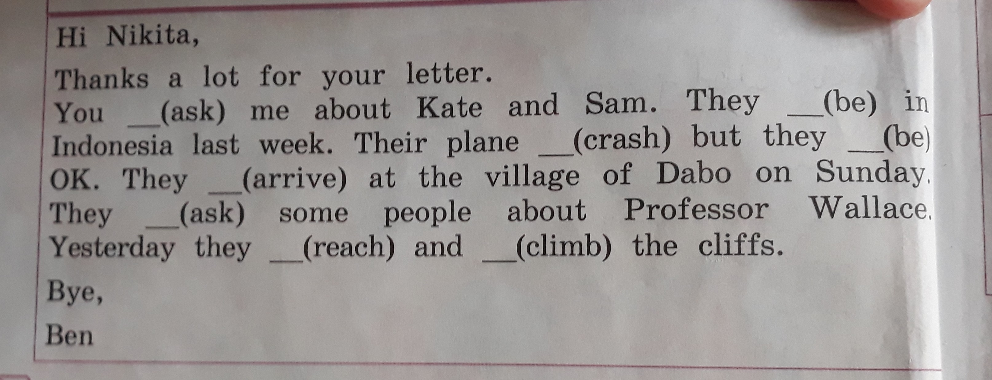 You asked me about Kate and Sam. They were in Indonesia last week. Their plane crashed but they were Ok. They arrived at the village of Dabo on Sunday. they asked some people about Professor Wallace. Yesterday they reached and climbed the cliffs.