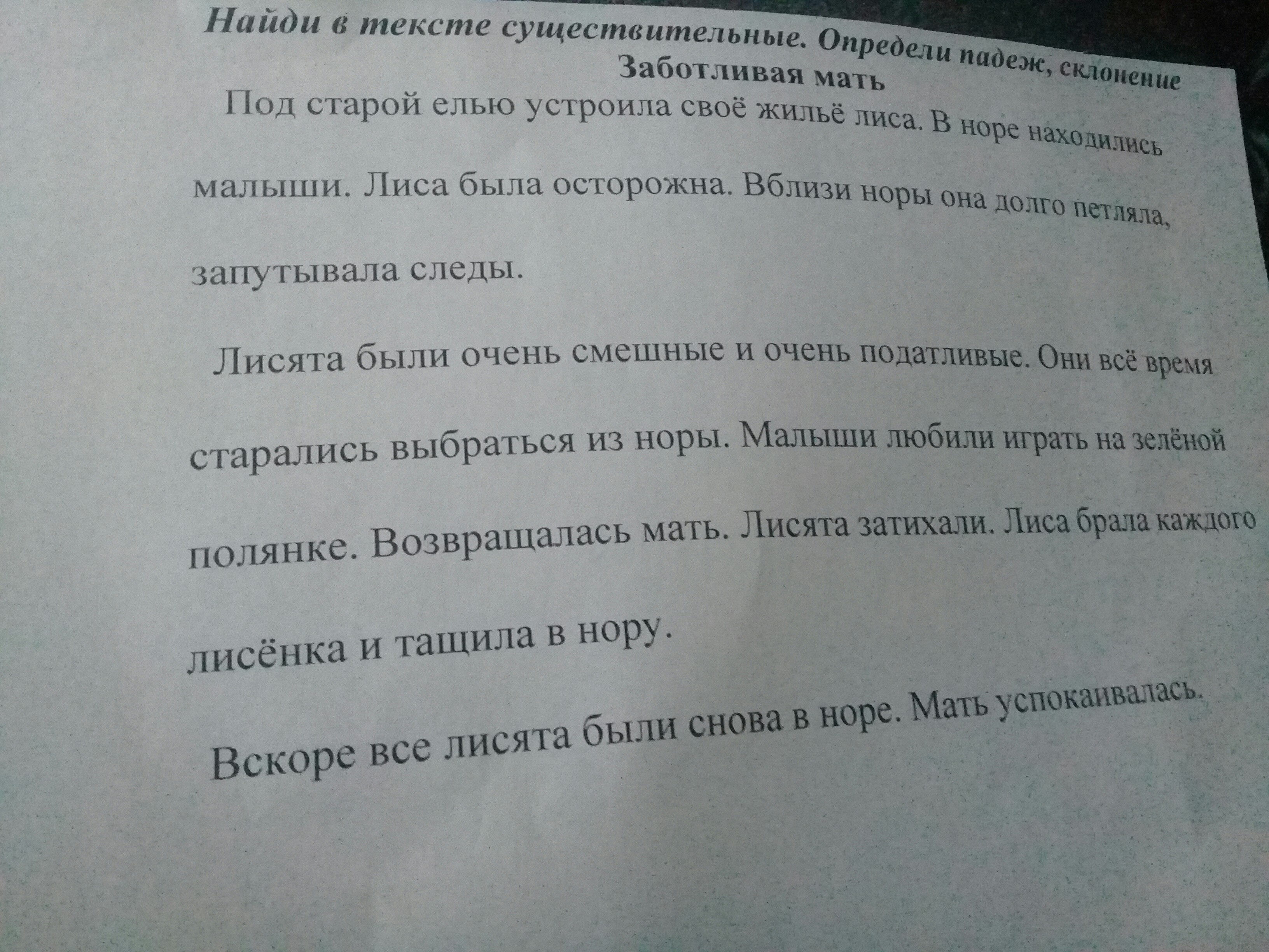 Елью (творительный, 3 скл), жилье (винительный, 2 скл), лиса (именительный, 1 скл), в норе (предложный, 1 скл), малыши (именительный, 2 скл),лиса (именительный,1 скл), норы (родительный, 1 скл), следы (винительный, 2 скл), лисята (именительный, 1 скл), из норы (родительный, 1 скл) , малыши(именительный,2 скл), полянке(предложный,1 скл), мать (именительный, 3 скл), лиса (именительный,1 скл),лисята (именительный, 1 скл), лиса(именительный, 1 скл), лисёнка (винительный, 2 скл), в нору (винительный, 1 скл), лисята (именительный, 1 скл), в норе (предложный, 1 скл), мать именительный, 3 скл)