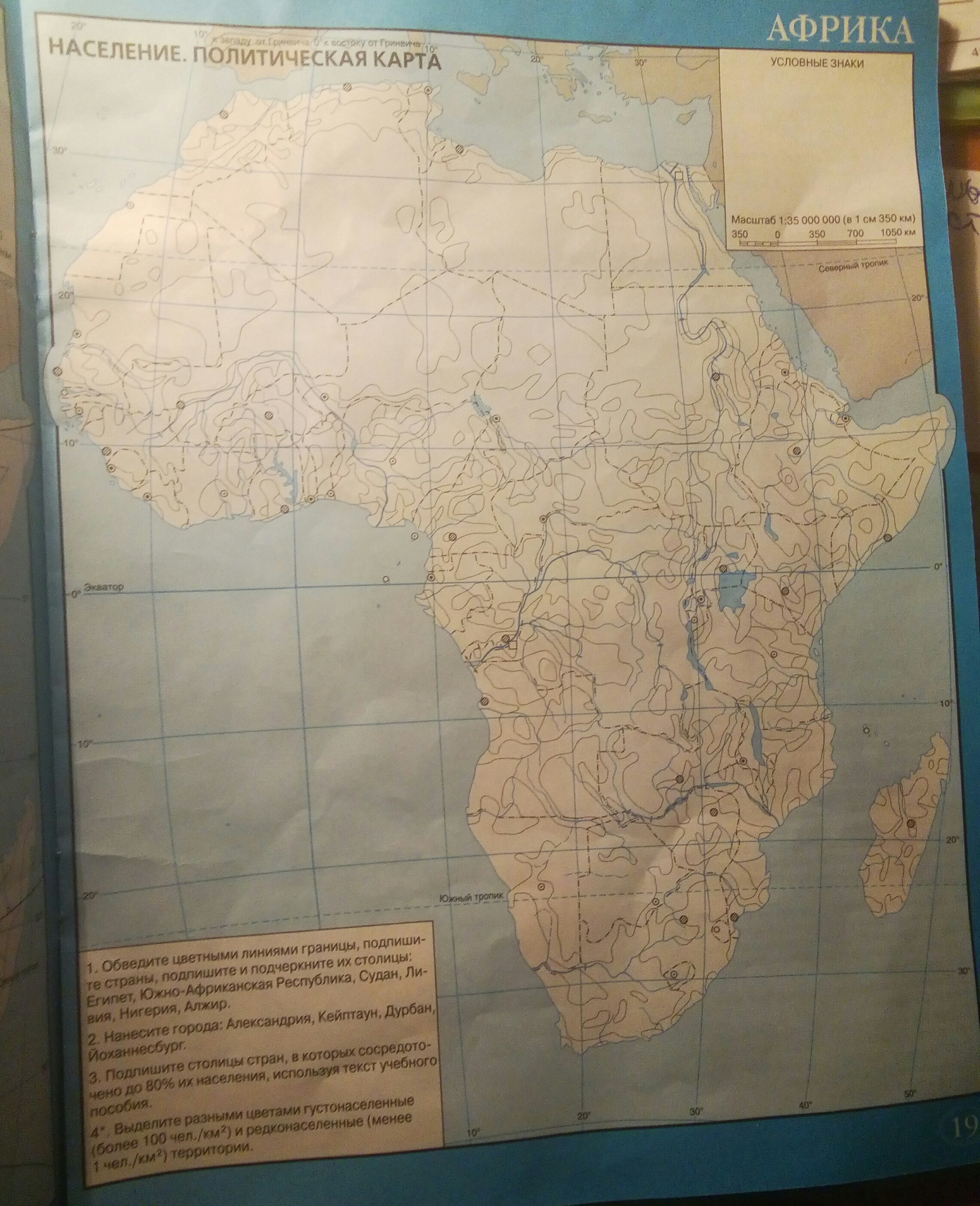1. Обведите цветными линиями границы, подпишете страны подпишете и подчеркните их столицы: Египет, Южно Африканская Республика, Судан, Ливия, Нигерия, Алжир. 2. Нанесите города: Александрия, Кейптаун, Дурбан, Йоханнесбург. 3. Подпещите сталицы стран, в каторфх сосредоточено до 80% их населения, используя текст учебного пособия. 4. Выделите разными цветами гостонаселенные (более 100 чел. км2) и редконаселенные ( менее 1 чел. км2) территории