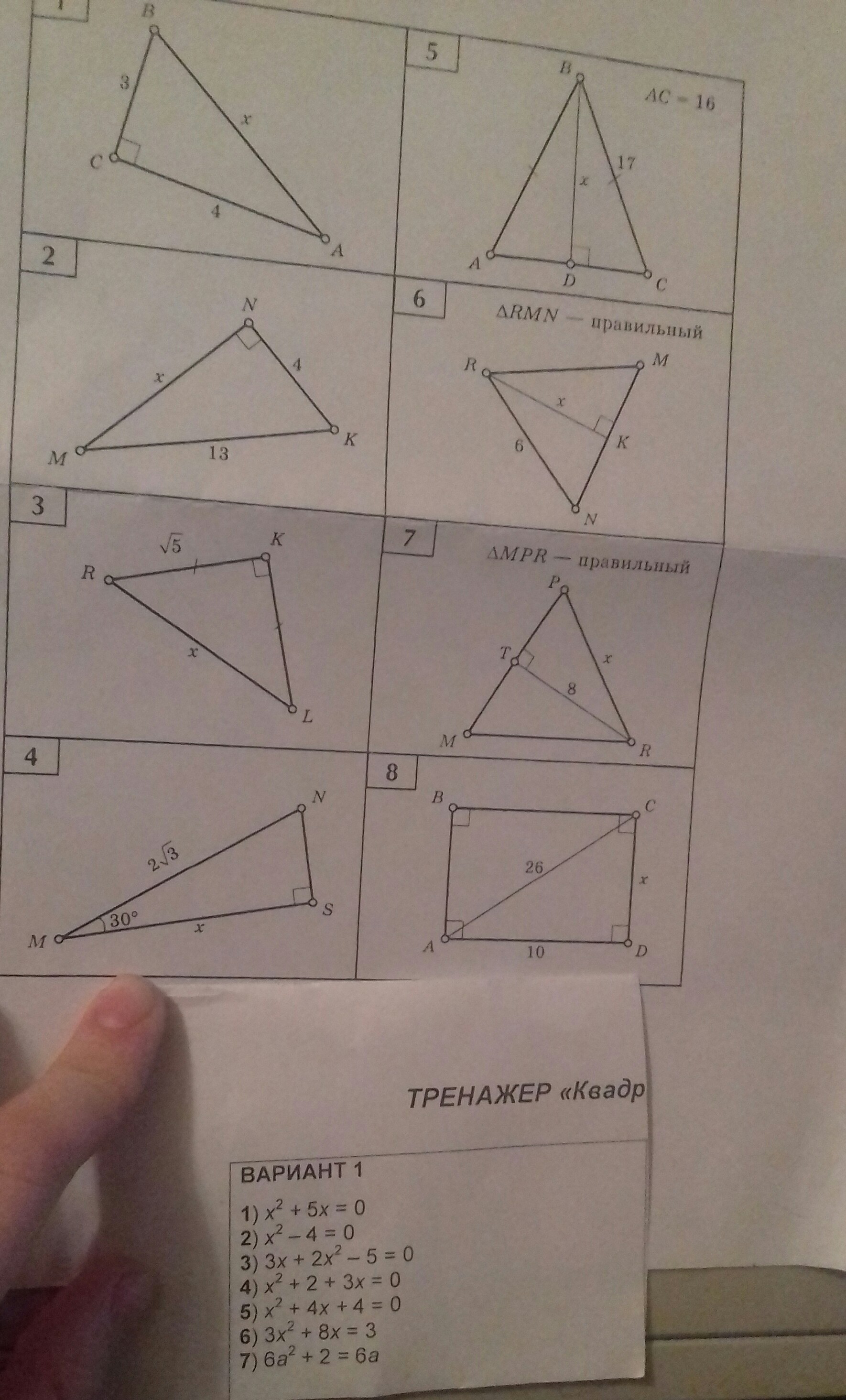 8) 26^2-10^2=x^2, x^2=676-100, x^2=576, x=24