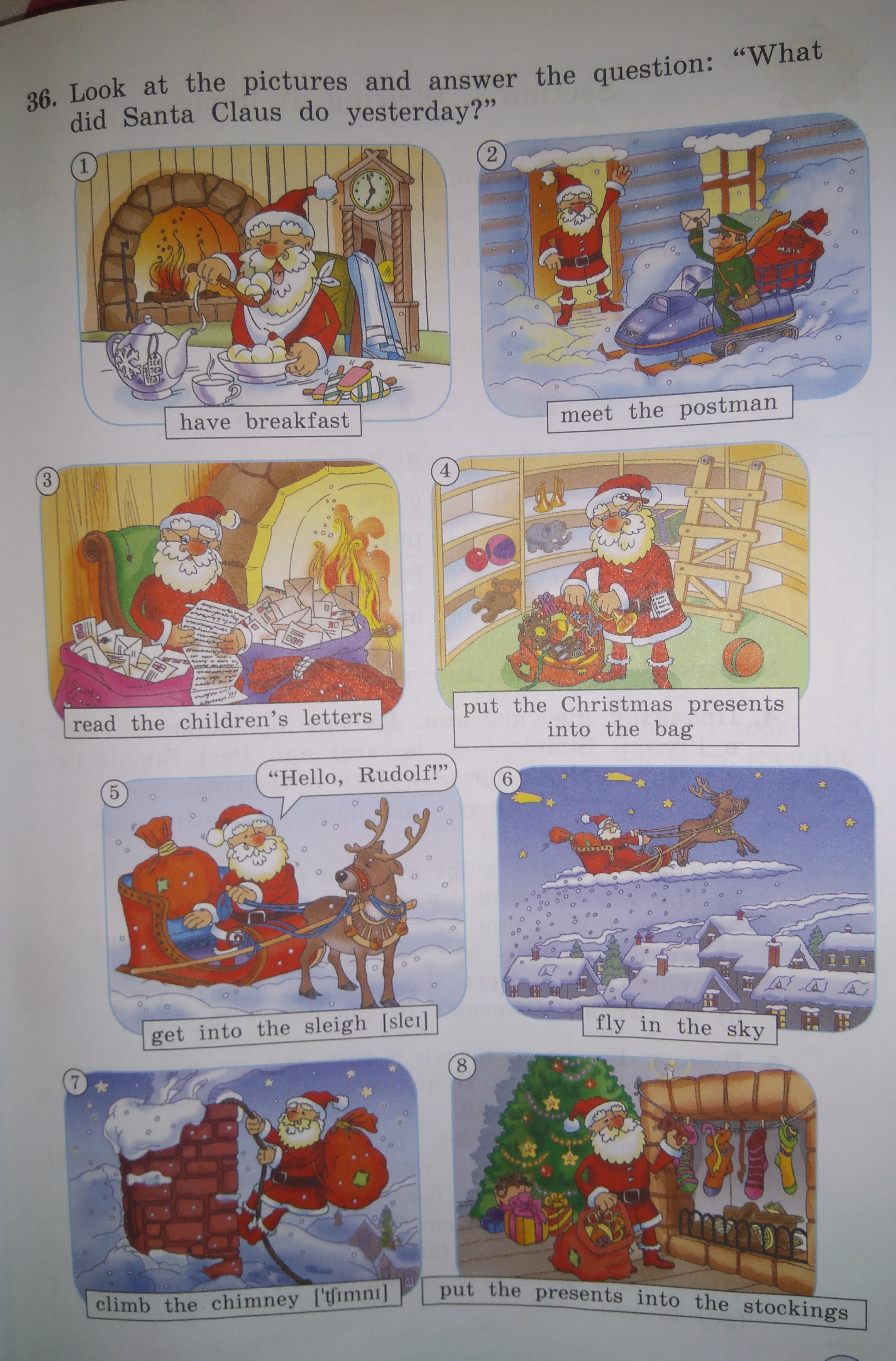 1)Завтракать2)Доставка почтальоном3)чтение детских писем4)готовка подарков5)Доставлять6)Лететь в небе7)Лезть по трубе8)Ложить подарки в носки.
