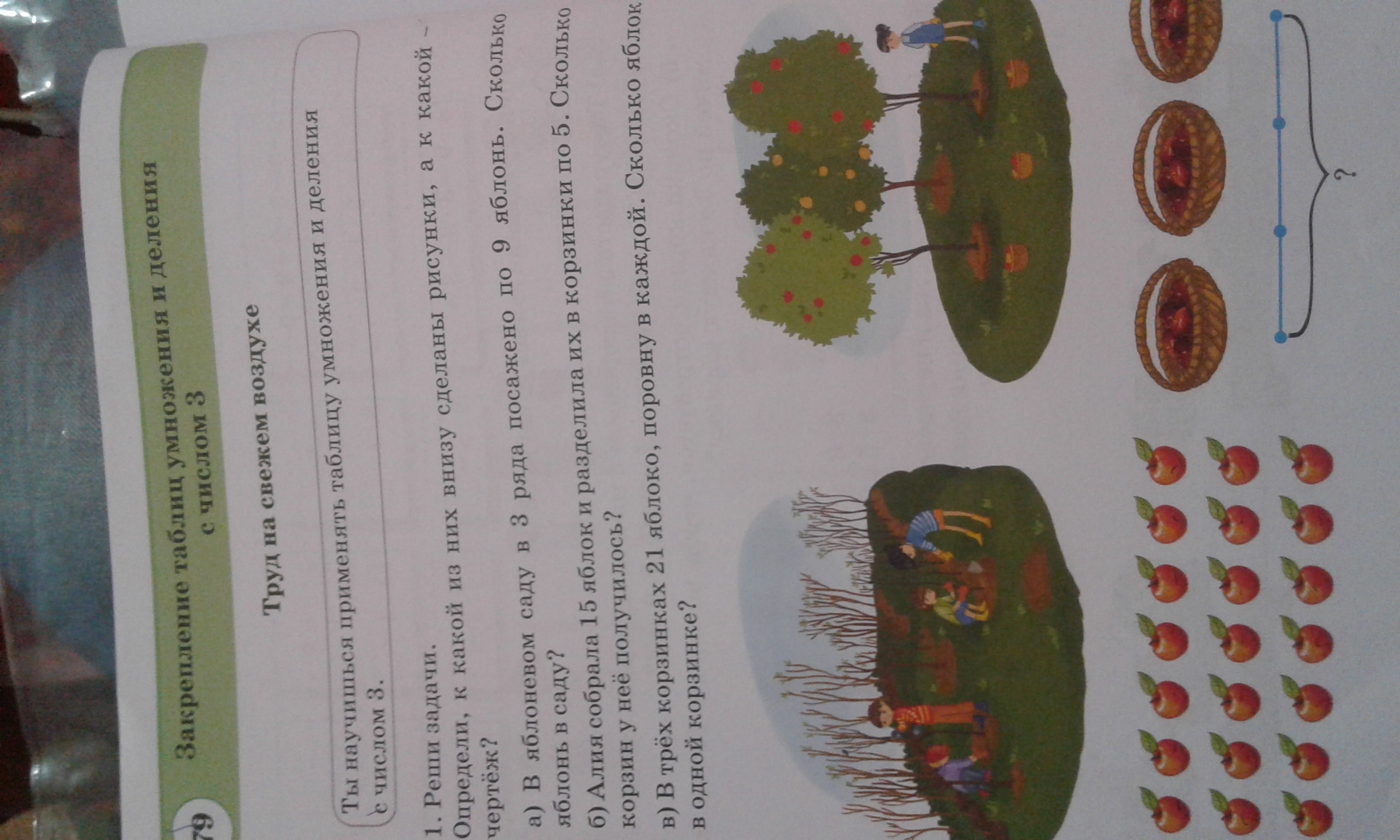 Определи к какой из них внизу сделаны рисунки а к какой чертёж? а) В яблоневом саду в 3 ряда посажено по 9 яблонь. сколько яблонь в саду?