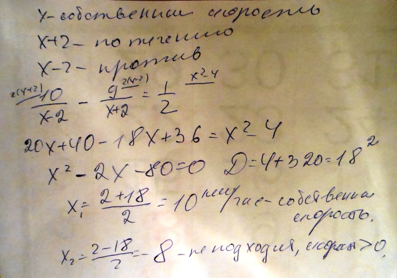 Моторная лодка прошла против течения 10 км, а по течению – 9 км, приче м по течению она шла на 30 мин меньше, чем против течения. Найдите собственную скорость лодки, если скорость течения 2 км/ч