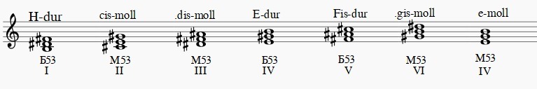 Учитывая то, что в тональности H-dur при ключе 5 диезов (си-ми-ля-ре-соль), получим следующие тональности, которые будут являться к H-dur родственными: