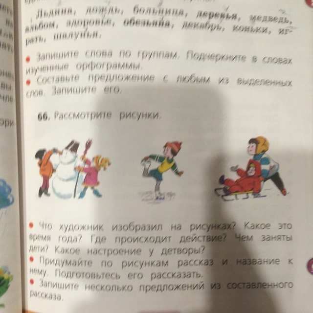 Я вижу во дворе детей. Все кто чем занят. Одни лепят снеговика, другие - катаются на коньках и санках. Я решил выйти на улицу. С неба падал беленький снежок. Дети радостно ловили его на язык. Зима - чудесное время года!
