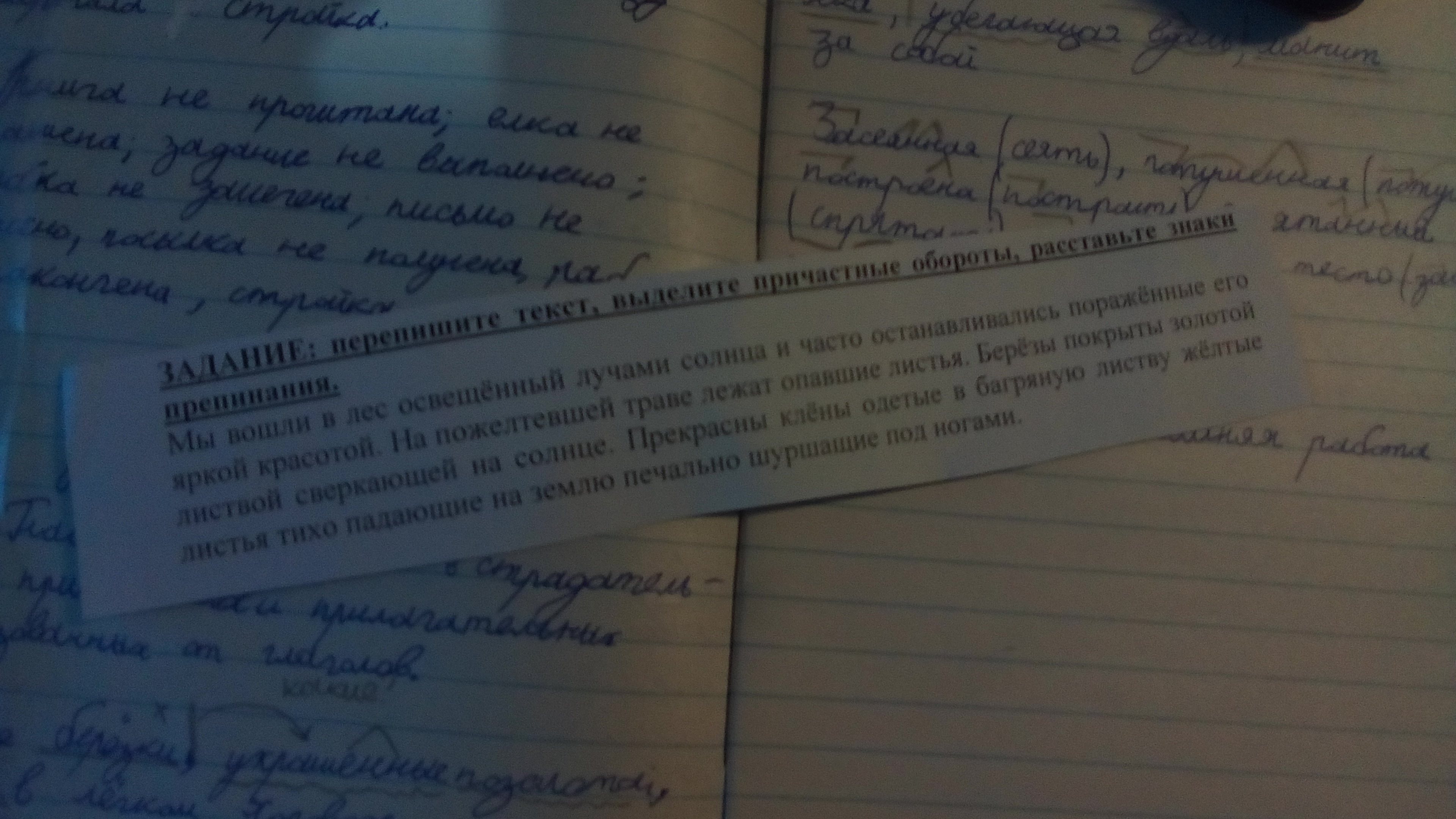 Мы вошли в лес, который был освещен лучами осеннего солнца, мы часто останавливались, пораженные его яркой красотой. На пожелтевшей траве лежат опавшие листья. Березы покрыты золотистой листвой, сверкающей на солнце. Прекрасные клены, одетые в багряную листву, жёлтые листья, тихо падающие на землю печально шуршащие по ногами. Возможно я где-то могла ошибиться.