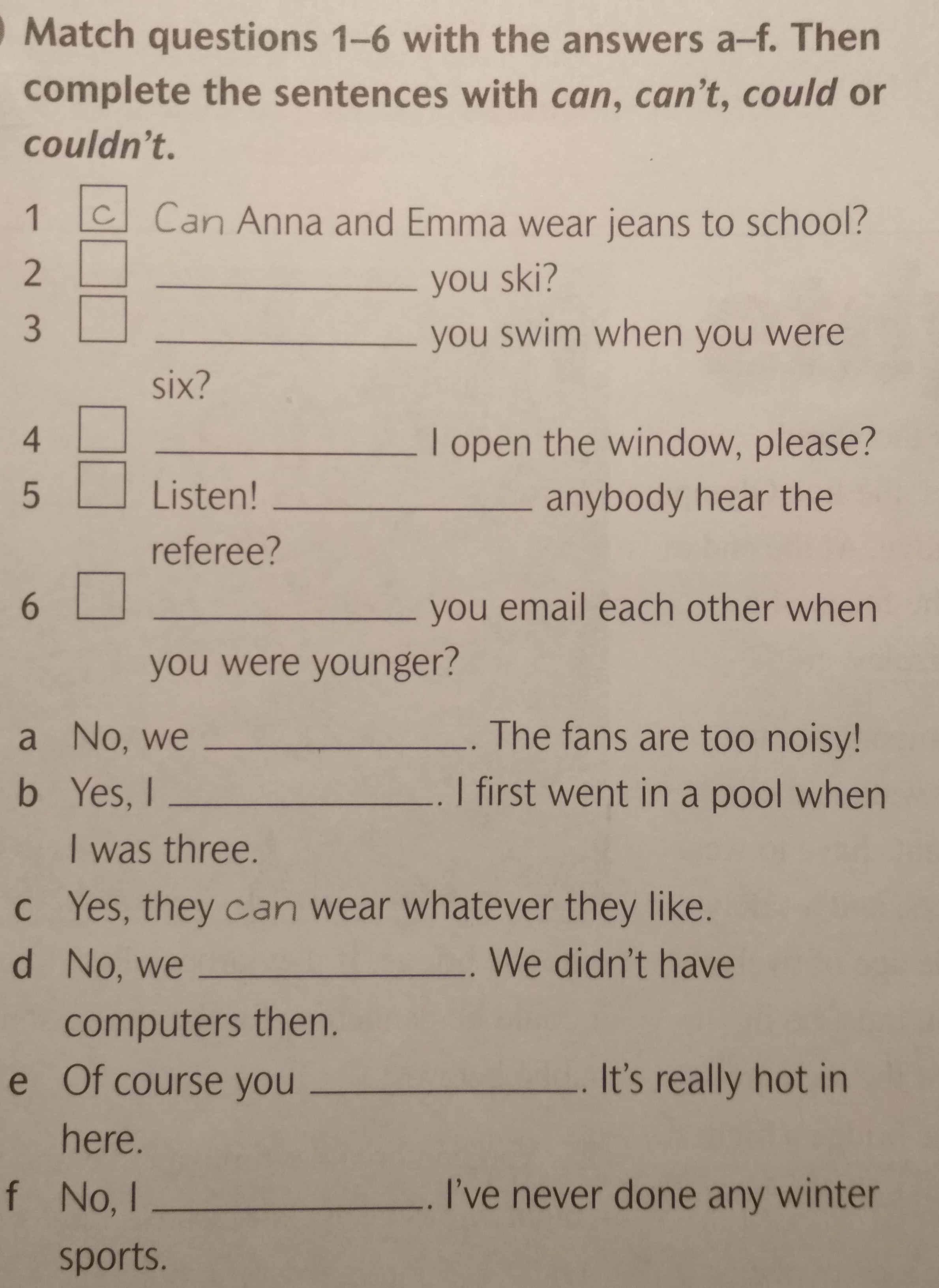 3. Could you swim when you were six? b Yes, I could. I first went in a pool when I was three.