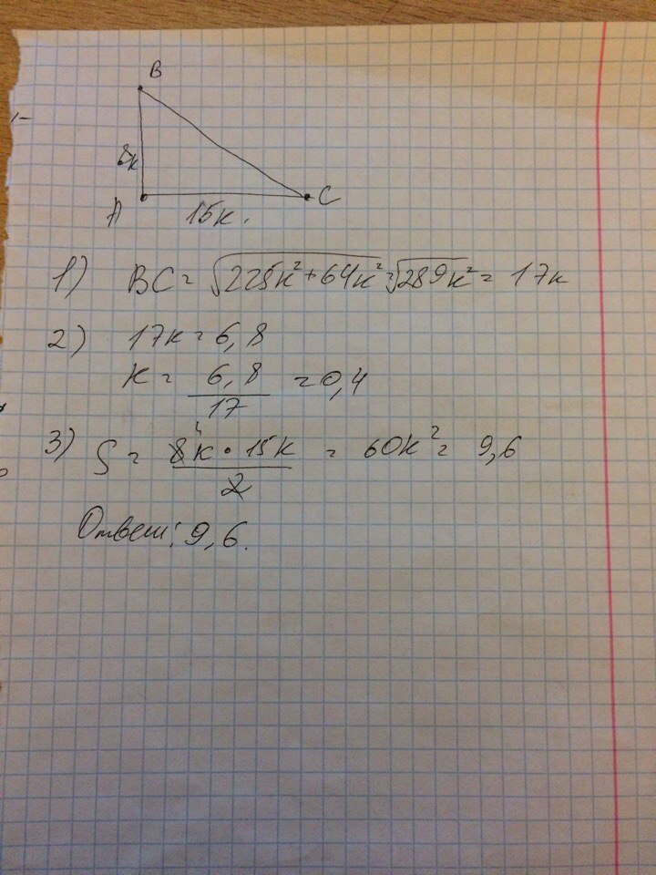 катеты прямоугольного треугольника относятся как 8:15 а гипотенуза равна 6,8 найдите площадь треугольника