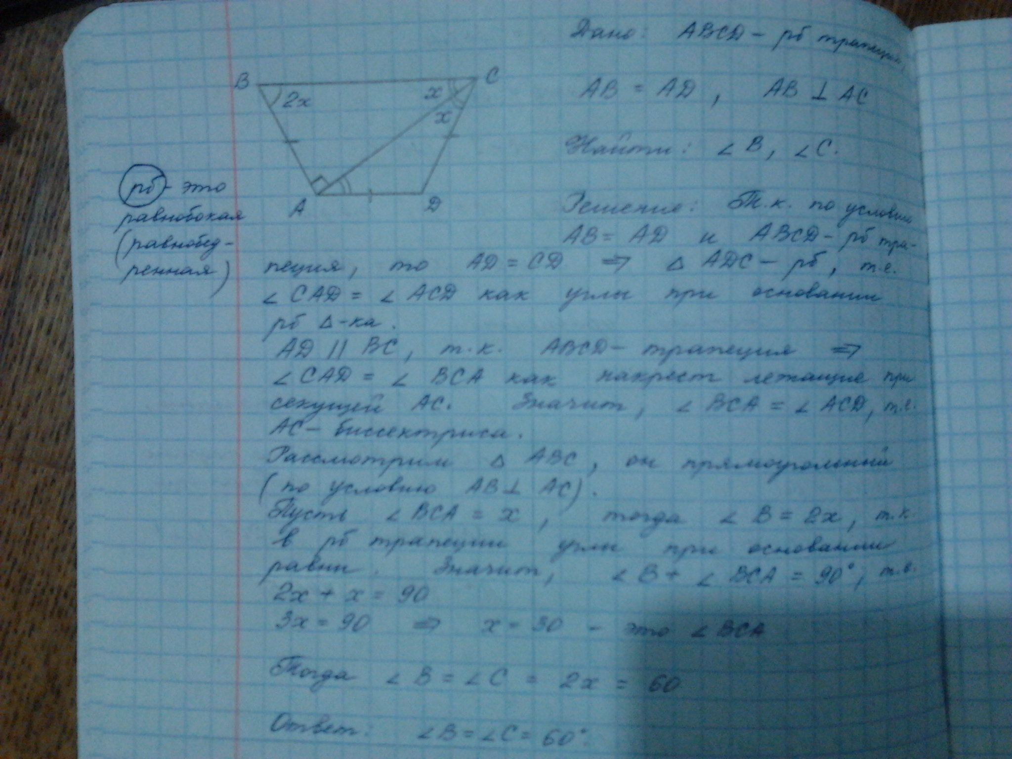 Найдите углы при большем основании равнобокой трапеции в которой боковая сторона равна меньшему основанию трапеции и перпендикулярна её диагонали.