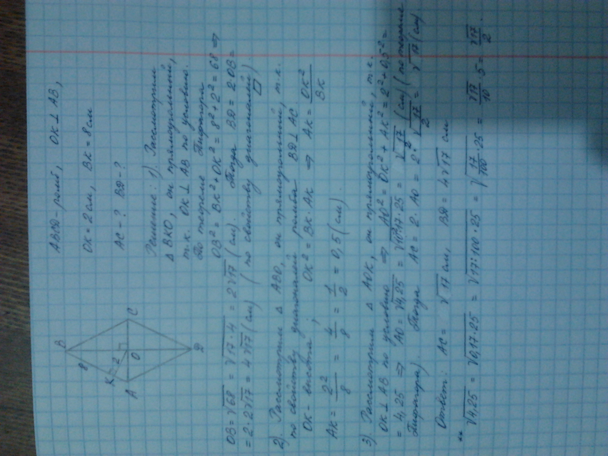 Диагонали ромба ABCD пересекаются в точке О. На стороне АВ взята точка К так, что прямая ОК перпендикулярна АВ. ОК - 2см, ВК - 8 см. Найдите диагонали ромба