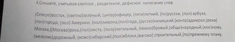4. Северо восток, светло-зелёный, унтер офицер, пятилетний, по-русски, пол арбуза, пол города, пол-Америки, пол-лимона, полгода, русско-немецкий, контр адмирал, река Москва, Москва-река, пол-листа, полулегальный, темно-бровый, общенародный, кое-кому, железнодорожный, новосибирский, пол яблока, вагоностроительный, по-прежнему плану.