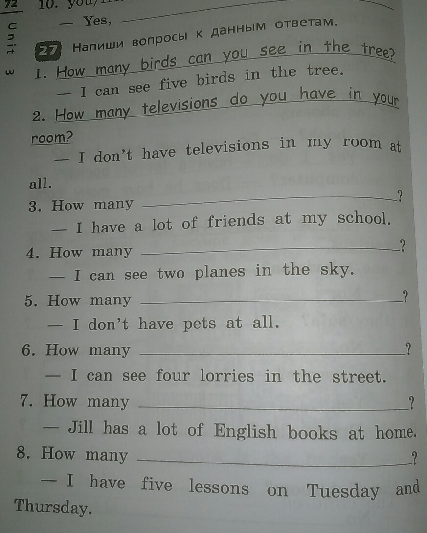 How many friends have you got at school? How many planes can you see in the sky? How many pets do you have? How many lorries can you see in the street? How many English books does Jill have at home? How many lessons do you have on Tuesdays and Thurasdays?