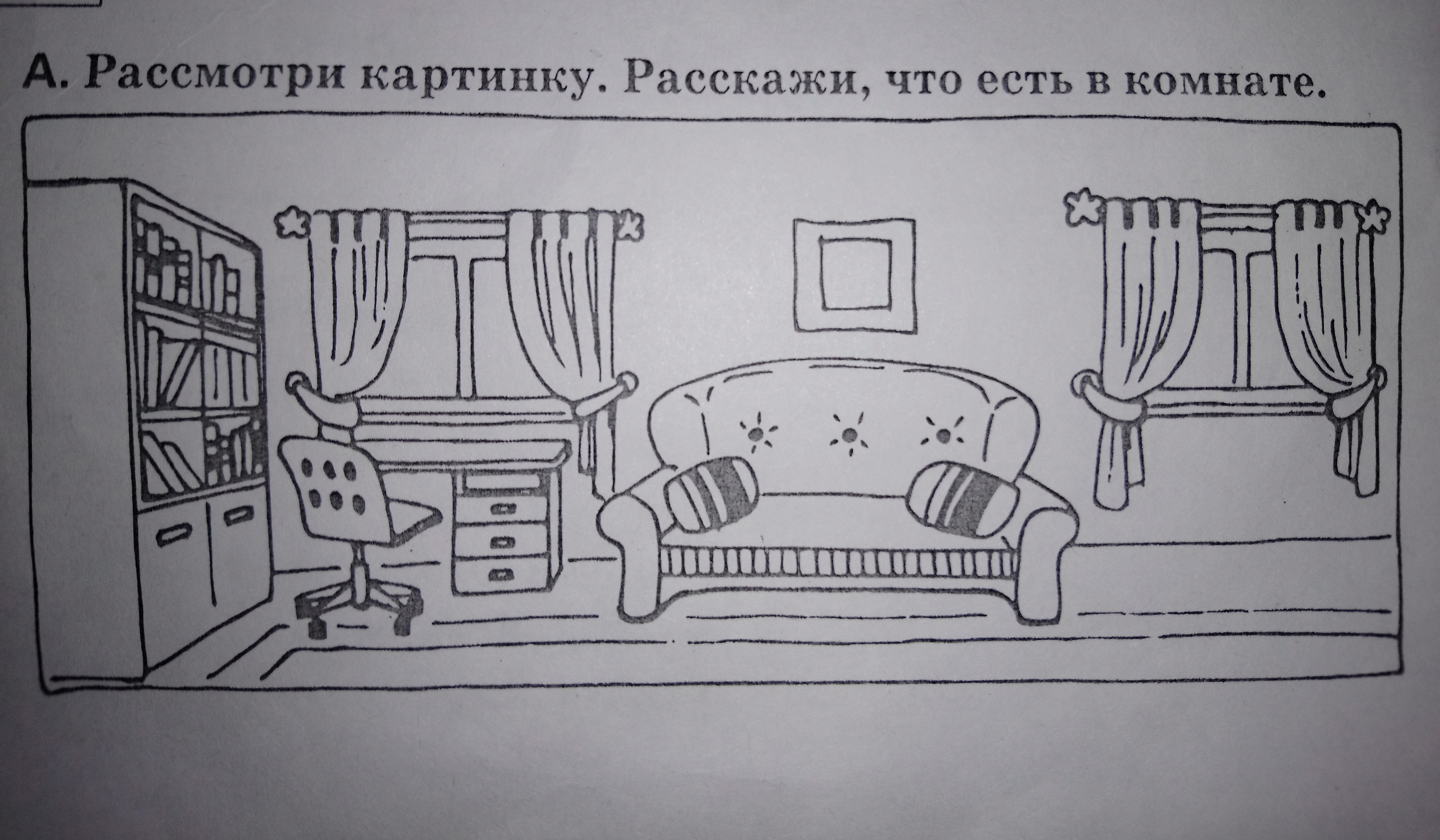 The room is big and bright because there are two windows. There are beautiful curtains on the windows. There is a sofa between windows and there is a picture above the sofa on the wall. There are two lovely cusions on the sofa an there is a big Indian carpet under the sofa on the floor. There is a desk on the right of the sofa and there is a chair next to the desk. There is a big and tall book cupboard on the right of the desk next to the wall. There are lot of books on the shelves in the cupboard.