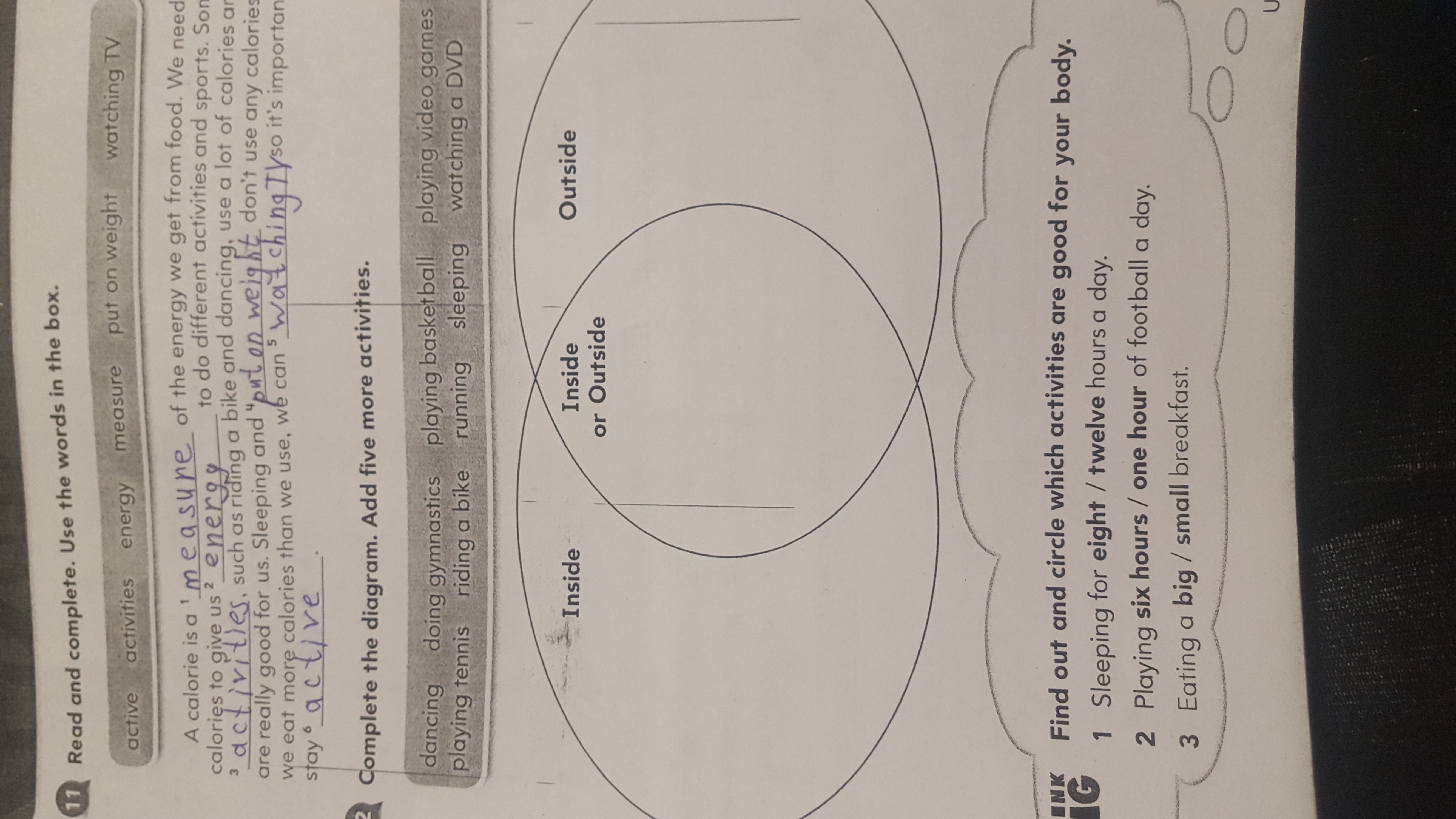 расставьте эти слова в категории: Inside(внутри помещения), inside or outside (внутри или снаружи помещения), outside(снаружи помещения)ю. Также от себя добавить еще пять разных видов активности