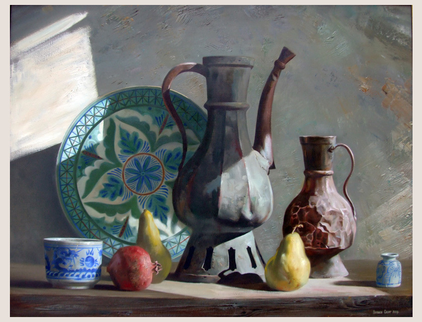 Представьте, что вы попали на восточный базар. Пестрая, шумная толпа, изобилие, бесконечный торг, аромат пряностей и фруктов, кричащие яркие краски, которые будто впитали в себя плавящийся от жары воздух и беспощадное солнце. И вдруг вы видите удивительный предмет, лишенный уже привычных глазу насыщенных красок, ваш взгляд приковывает металл, воплощенный в изящной форме кувшина. Как песня акына раздается по бескрайним степям Азии, так вьется по телу кувшина замысловатый орнамент. Восточный кувшин гибок, словно изящная молодая девушка и крепок, как оружие война. Он создавался на века, чтобы служить многим поколениям, а потому прочность, удобство и красота – его основные достоинства.К чему эта ода восточному кувшину? И зачем я вас отвела на восточный базар? Чтобы вы прониклись волшебством атмосферы и ощутили аромат родины предметов, изображенных на этих натюрмортах. Автор представленных сегодня картин – художник Сабит Нуримов.