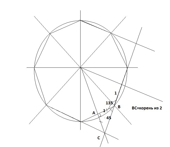 Сторона правильного восьмиугольника равна 2 см его стороны взятые через одну продолжили до пересечения так что образовался квадрат найдите сторону этого квадрата