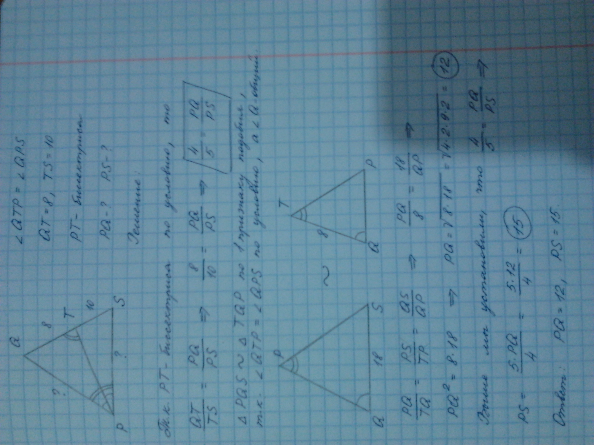 В треугольнике PQS проведина биссектриса PT. Найдите стороны PQ и PS, если QT= 8, TS=10 и угол QTP = углу QPS