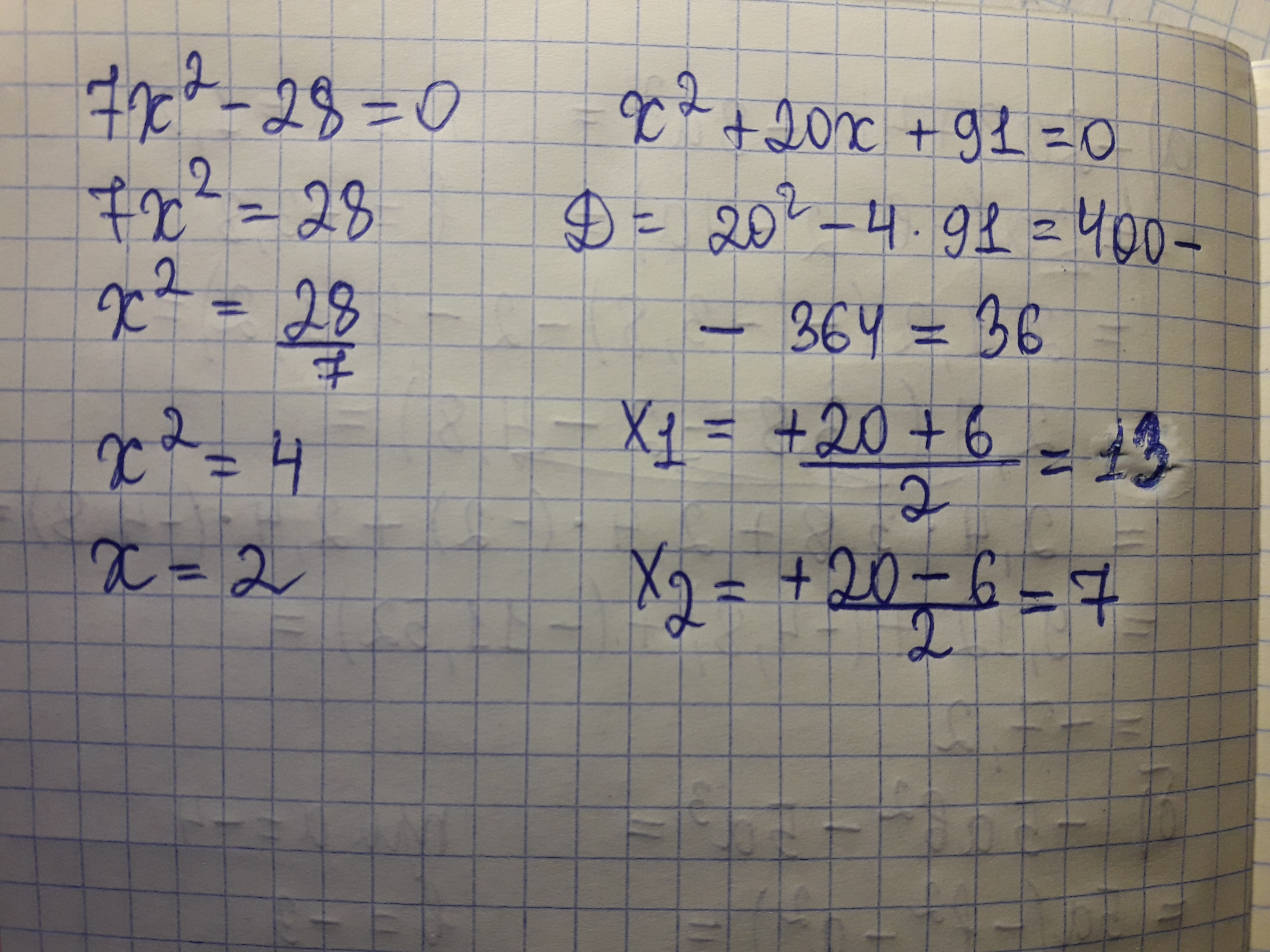 D=b^2-4ac=400 - 4 * 91 * 1= 400 - 364 = 36