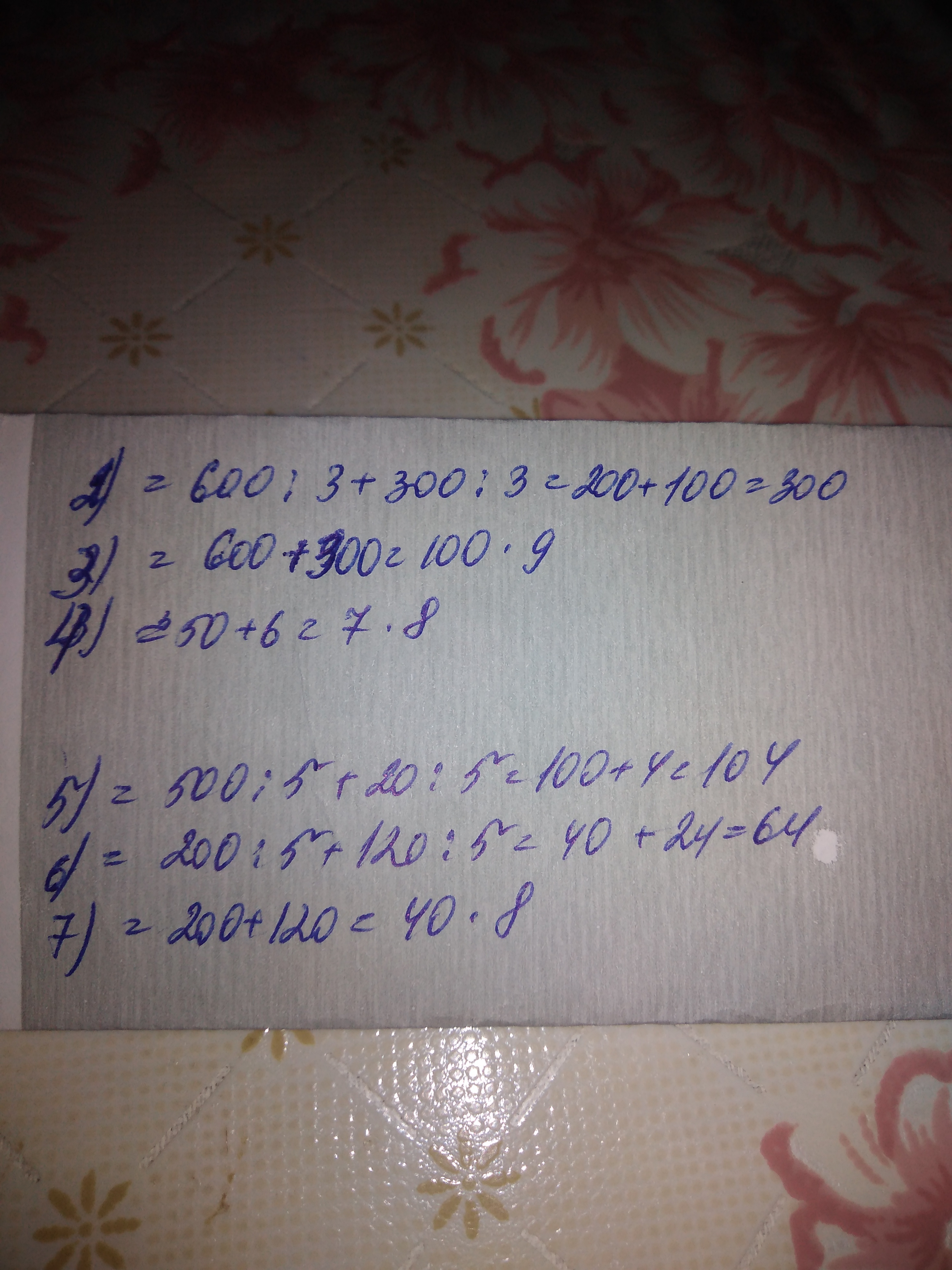 способа. Всего написано 6 примеров,а надо 12 напишите пожалуйста второй способ. 1. (600+300)÷3=300 2. (600+300):9=100 3. (50+6)÷8=7 4. (500+20)÷5=104 5. (200+120)÷5=64. 6. (200+120)÷8=40. Теперь напишите 2 способ с этой же суммой