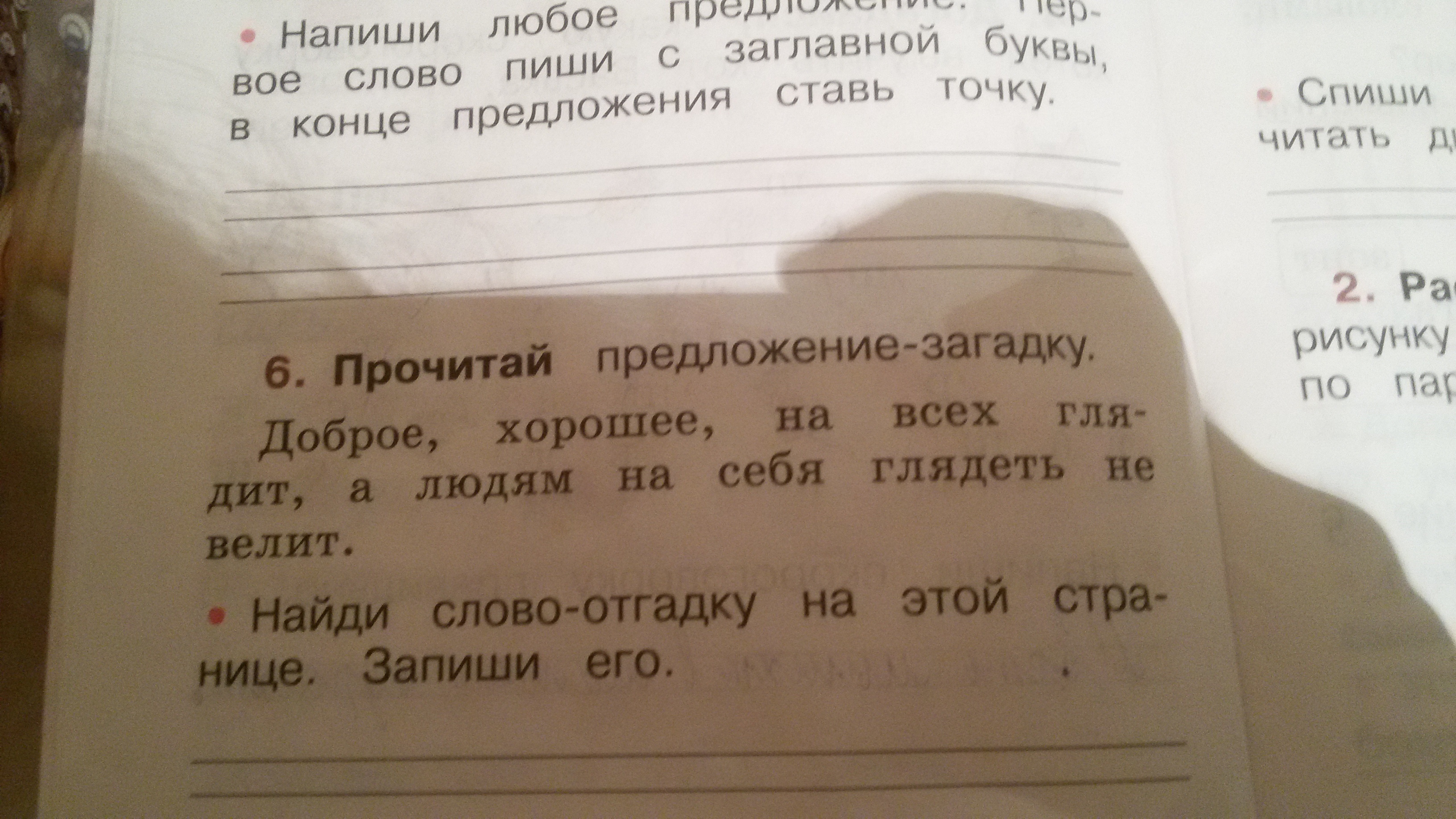Помогите пожалуйста срочно Прочитайте предложение загадку доброе хорошее на всех глядит а людям на себя глядеть не велит