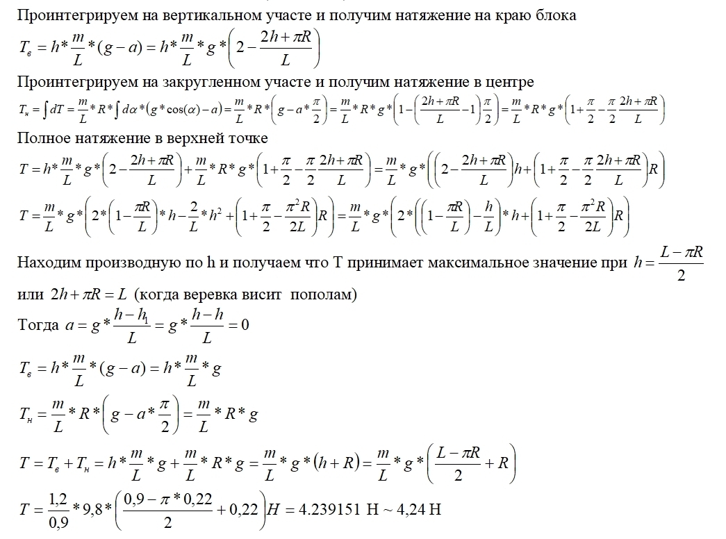 S=0,5(L-πR) - длина свисающей части каната с одной стороны.