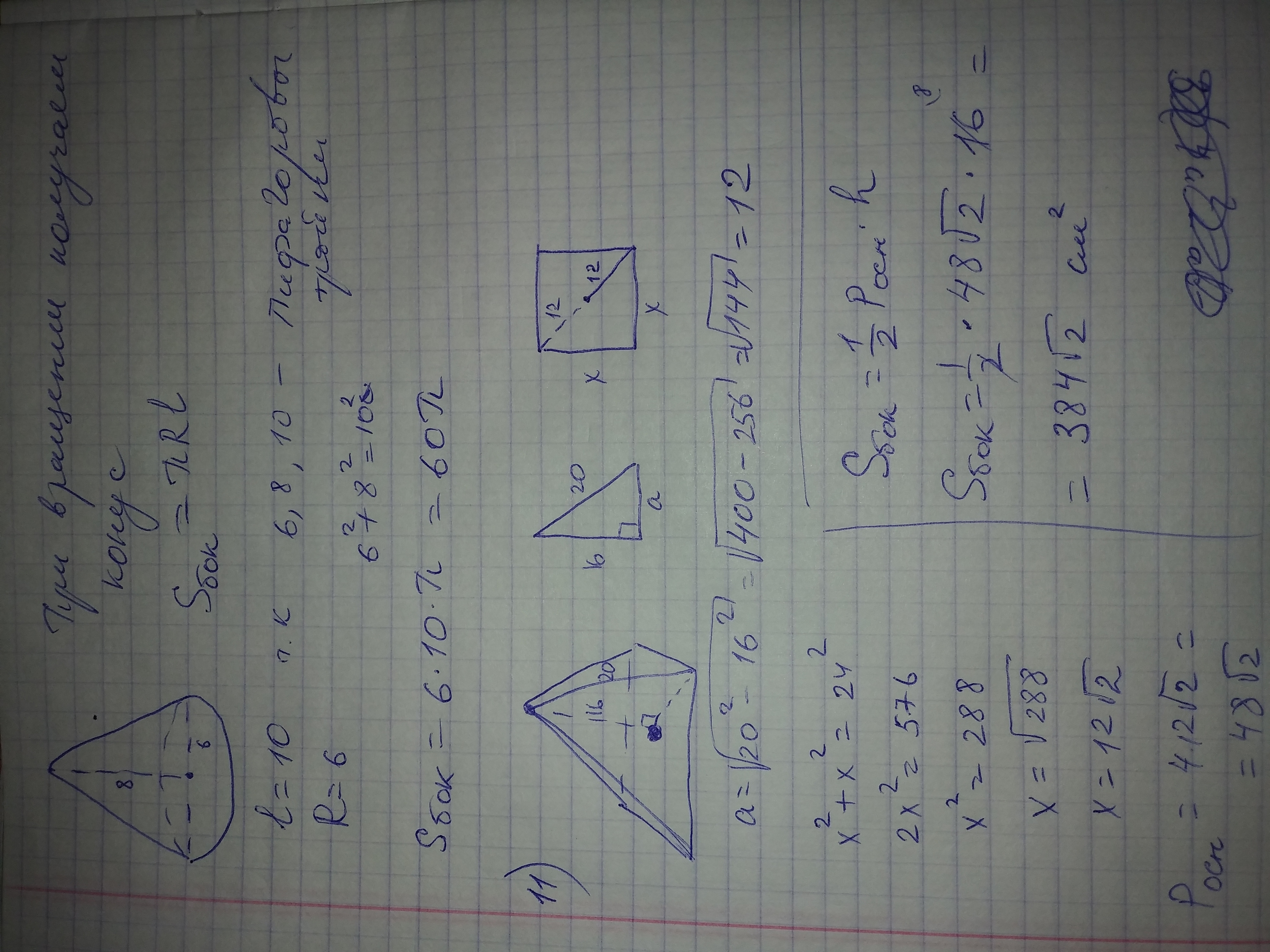 11.Высота правильной четырехугольной пирамиды равна 16 см а боковое ребро 20 см Найдите площадь боковой поверхности пирамиды. (рисунок).