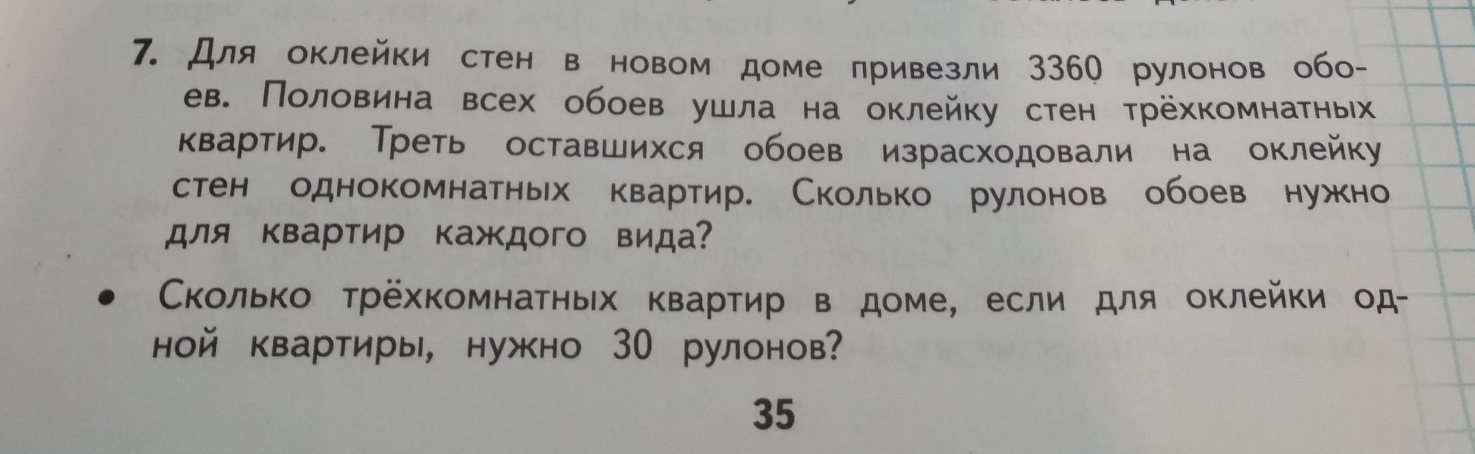 1) Сперва нам надо узнать сколько рулонов ушло на 3- х комн квартир ну это 3360/2=1680