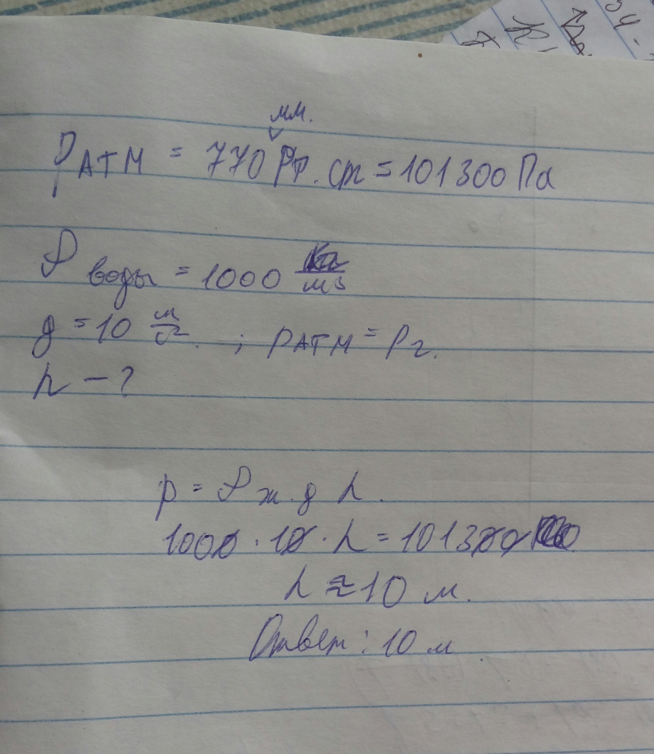 ρ = 1 000 кг/м³ - плотность воды